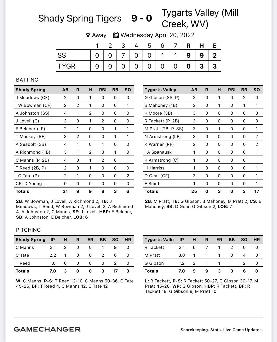 Shady Spring 9, Tygarts Valley 0