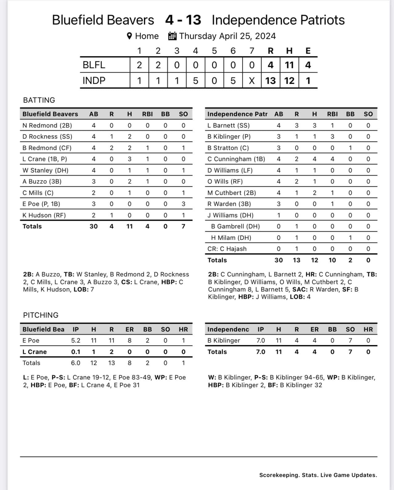 The Patriots scored five runs in both the fourth and sixth innings to roll past Bluefield 13-4 on Senior Night.