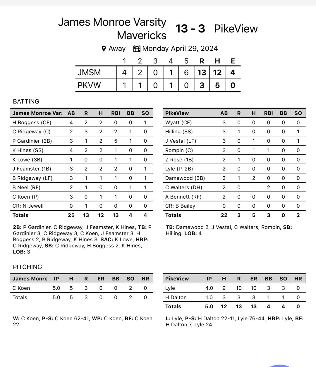 James Monroe 13, PikeView 3 (5 innings)