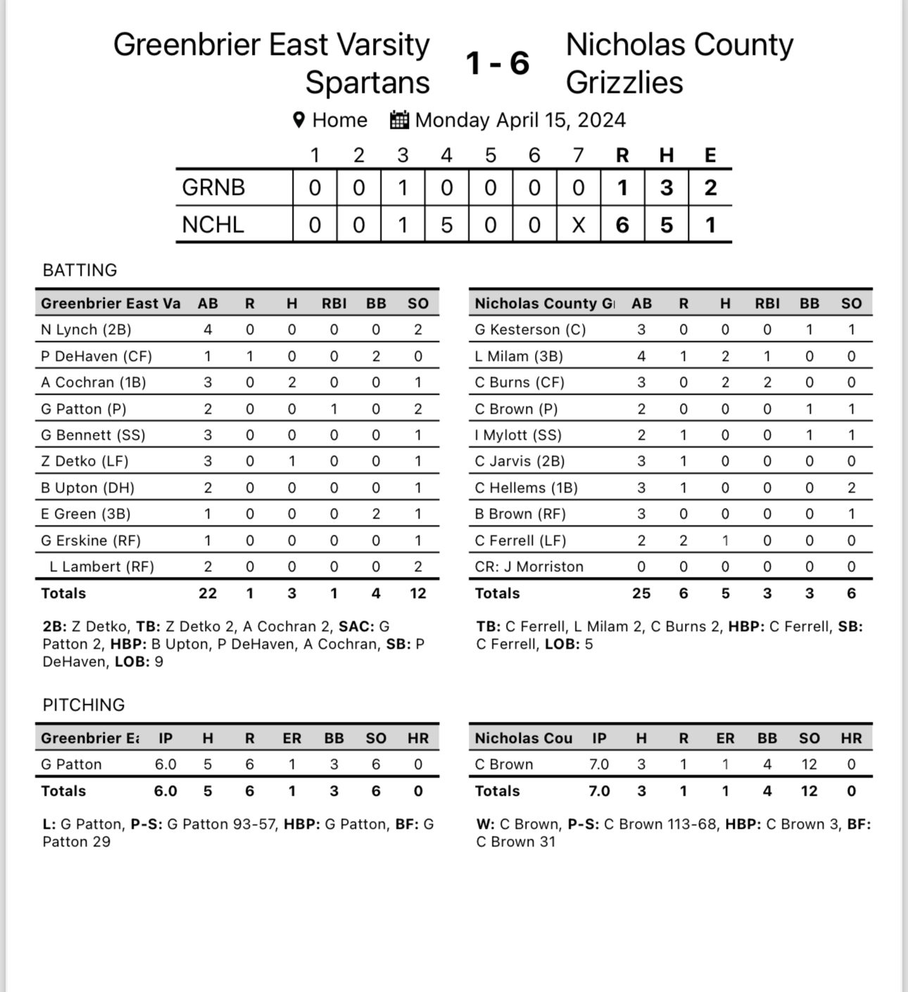 Summersville – Cole Brown clamped Greenbrier East’s lineup as the Nicholas County secured a 6-1 win over the Spartans Monday in Summersville.