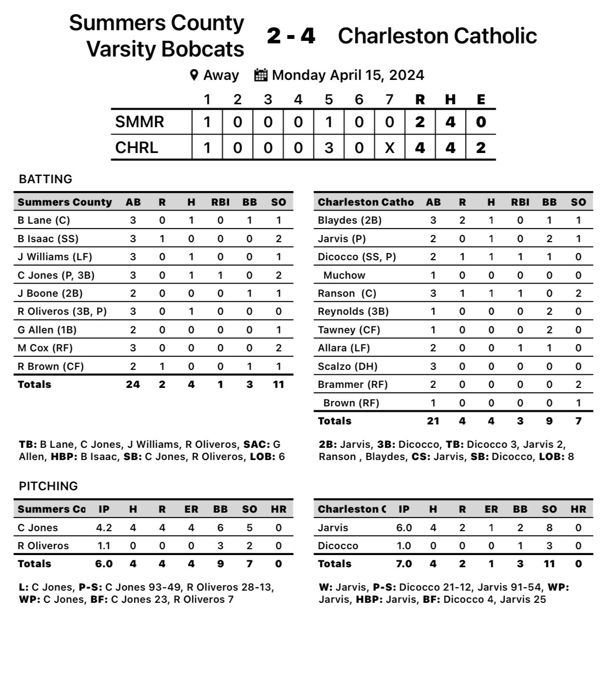 Charleston – Charleston Catholic scored three runs in the fifth inning, just enough to fend off Summers County 4-2 Monday in Charleston.
