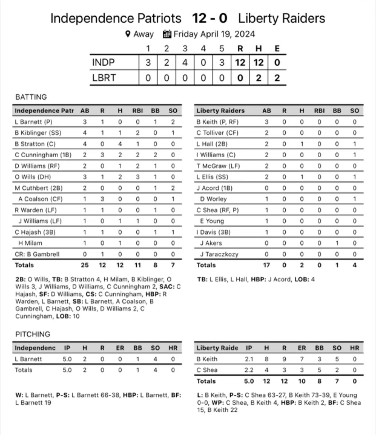 Glen Daniel – Independence collected as many hits as runs Friday as the Patriots secured a 12-0 win over rival Liberty in Glen Daniel.