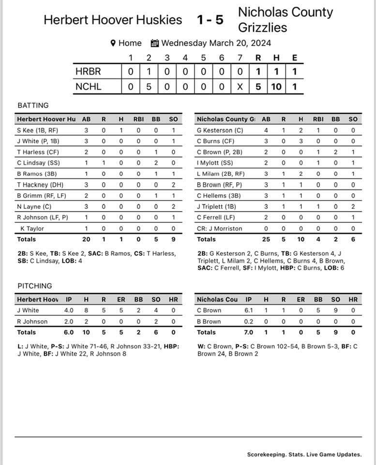 Summersville – Nicholas County hung five on Herbert Hoover in the bottom of the second to take a 5-1 decision over the Huskies.
