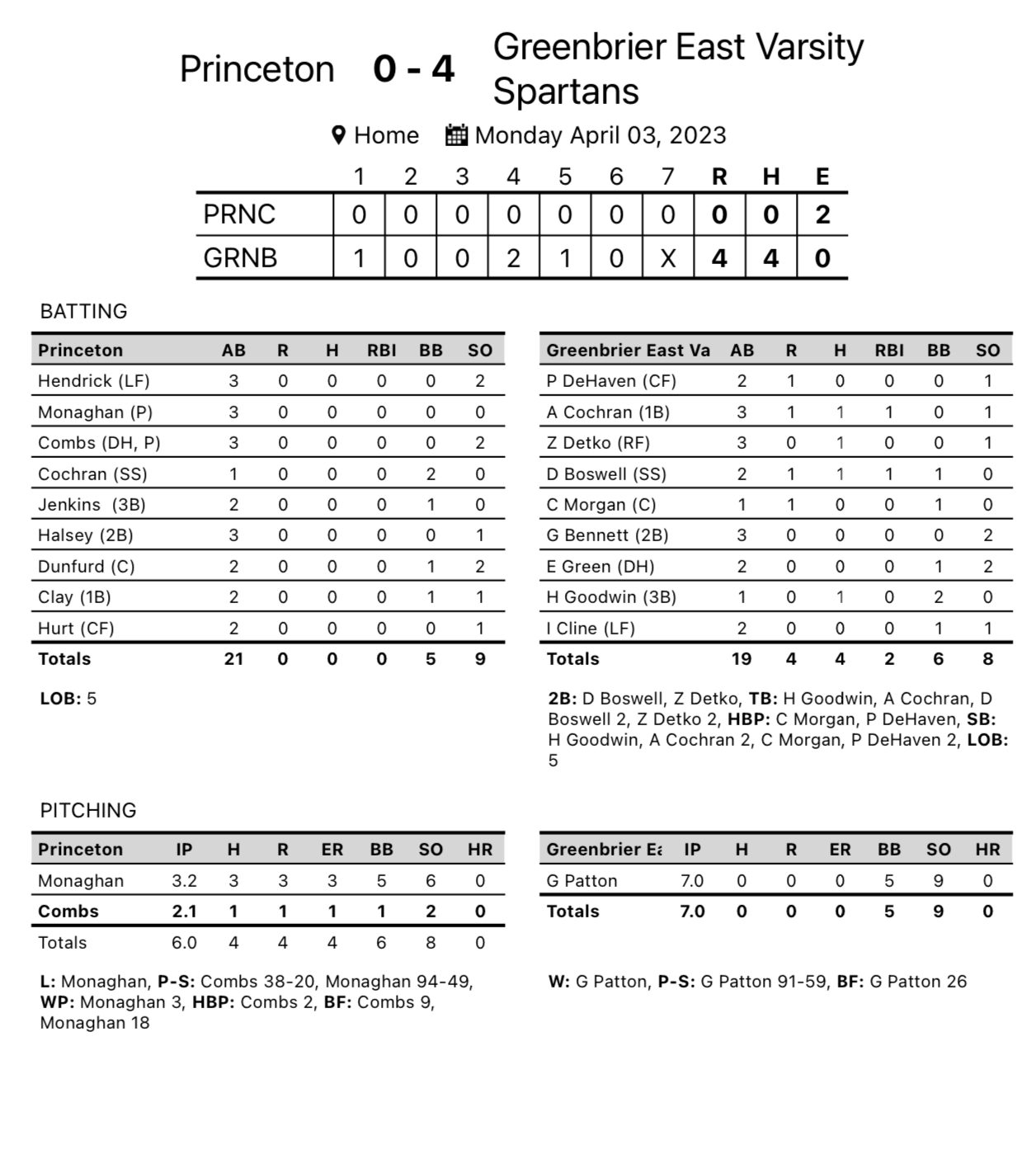 Fairlea – Gabe Patton went the distance Monday, tossing a no-hitter in a 4-0 win over sectional foe Princeton in Fairlea.