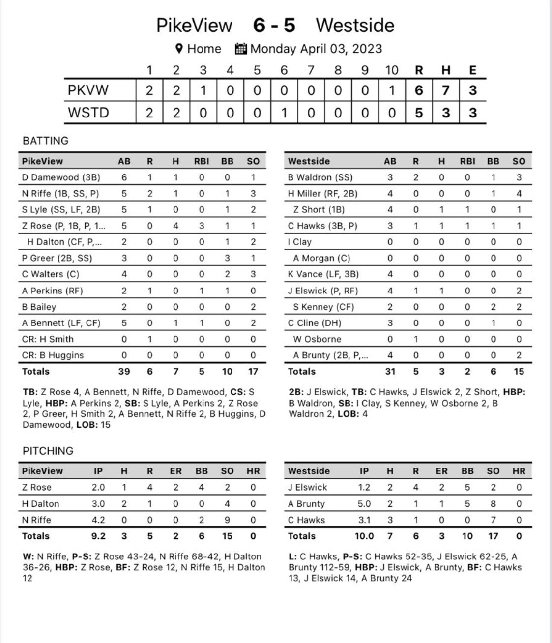 Clear Fork – PikeView outlasted Westside in Clear Fork Monday, picking up a 6-5 win in 10 innings.