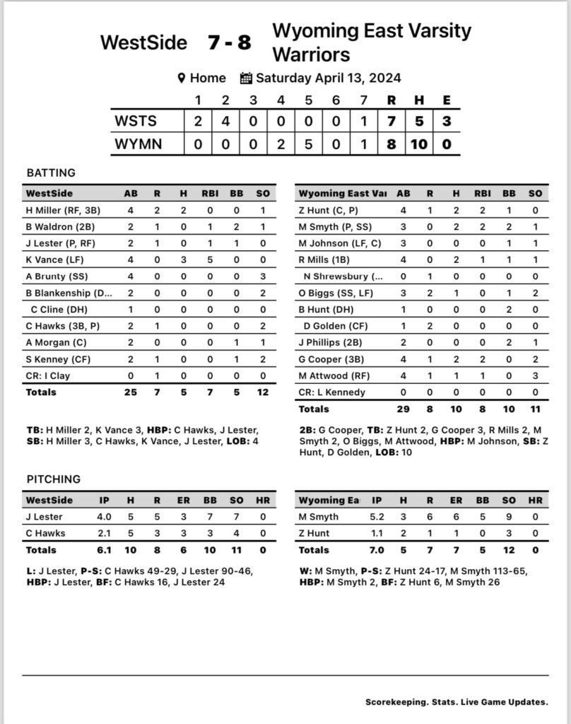 Gage Cooper had two hits, including a double, and two RBI. Hunt and Miken Smyth also had a pair of hits and two RBI for Wyoming East (7-3).