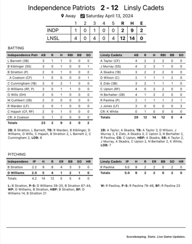 Linsly scored four runs in the first, third and fifth innings. Blake Stratton and Levi Barnett had doubles, while Cunningham and Williams each had one RBI.