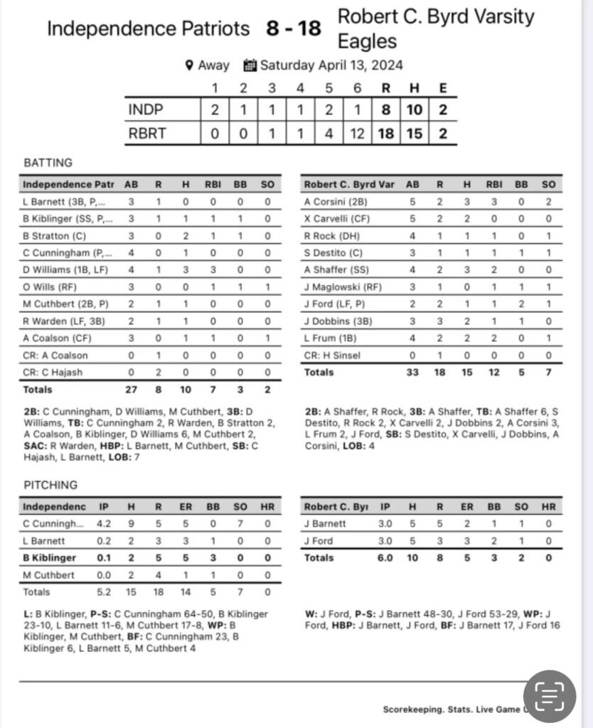 Robert C. Byrd scored 12 runs in the bottom of the sixth to defeat the Patriots 18-8, while Linsly Academy topped Indy 12-2 in five innings.