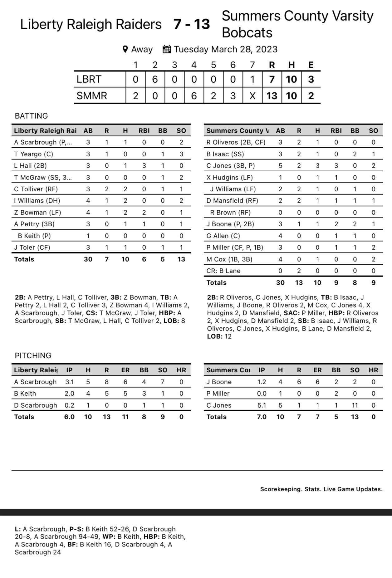 Hinton – Trailing 6-2 heading into the bottom of the fourth inning, Summers County exploded for 11 runs over the next three innings to secure a 13-7 win against Liberty Tuesday in Hinton.