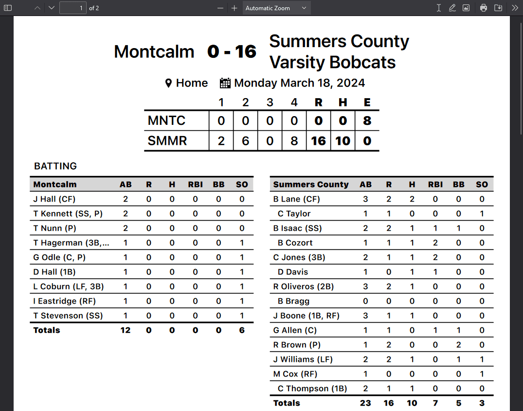 Ben Lane had two hits and stole five bases, while Colton Jones and Braiden Cozort each had a double and two RBI.
