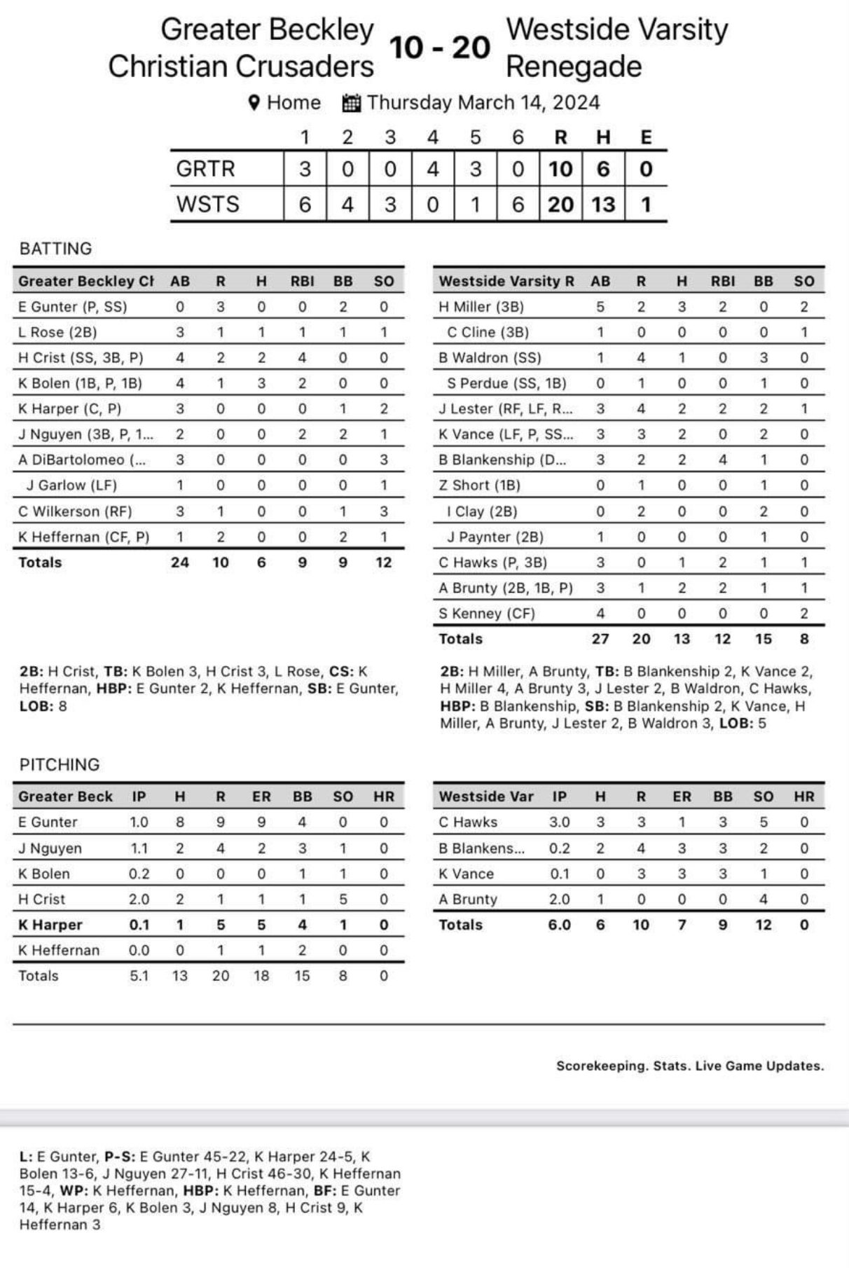 Clear Fork – Westside scored six runs in the bottom of the first inning and never let up, rolling to a 20-10 victory against Greater Beckley Thursday in Clear Fork.