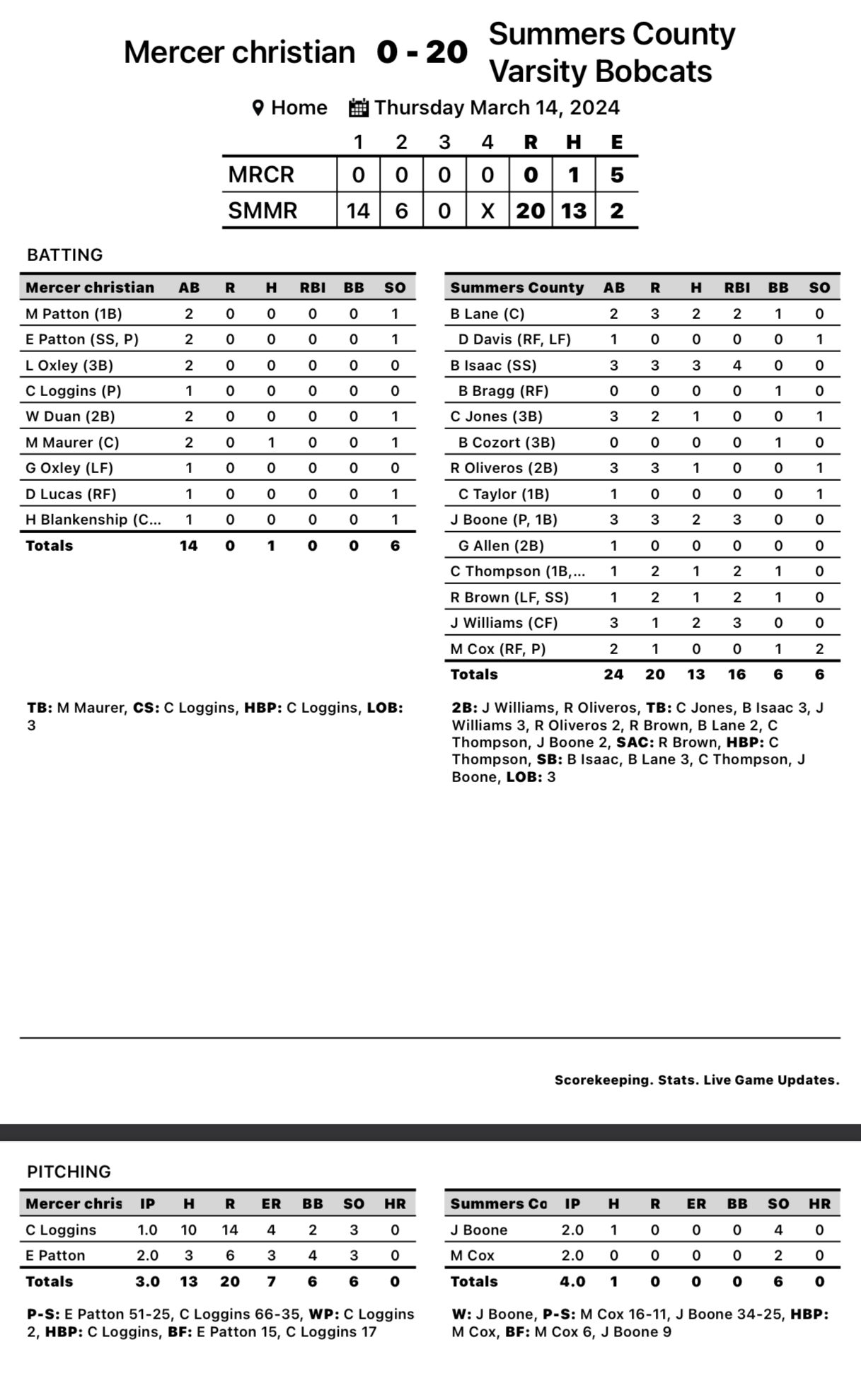 Hinton – Brandan Isaac extended his on-base streak into the new season, make it 30 games in a row as Summers downed Mercer Christian 20-0 Thursday night in Hinton.