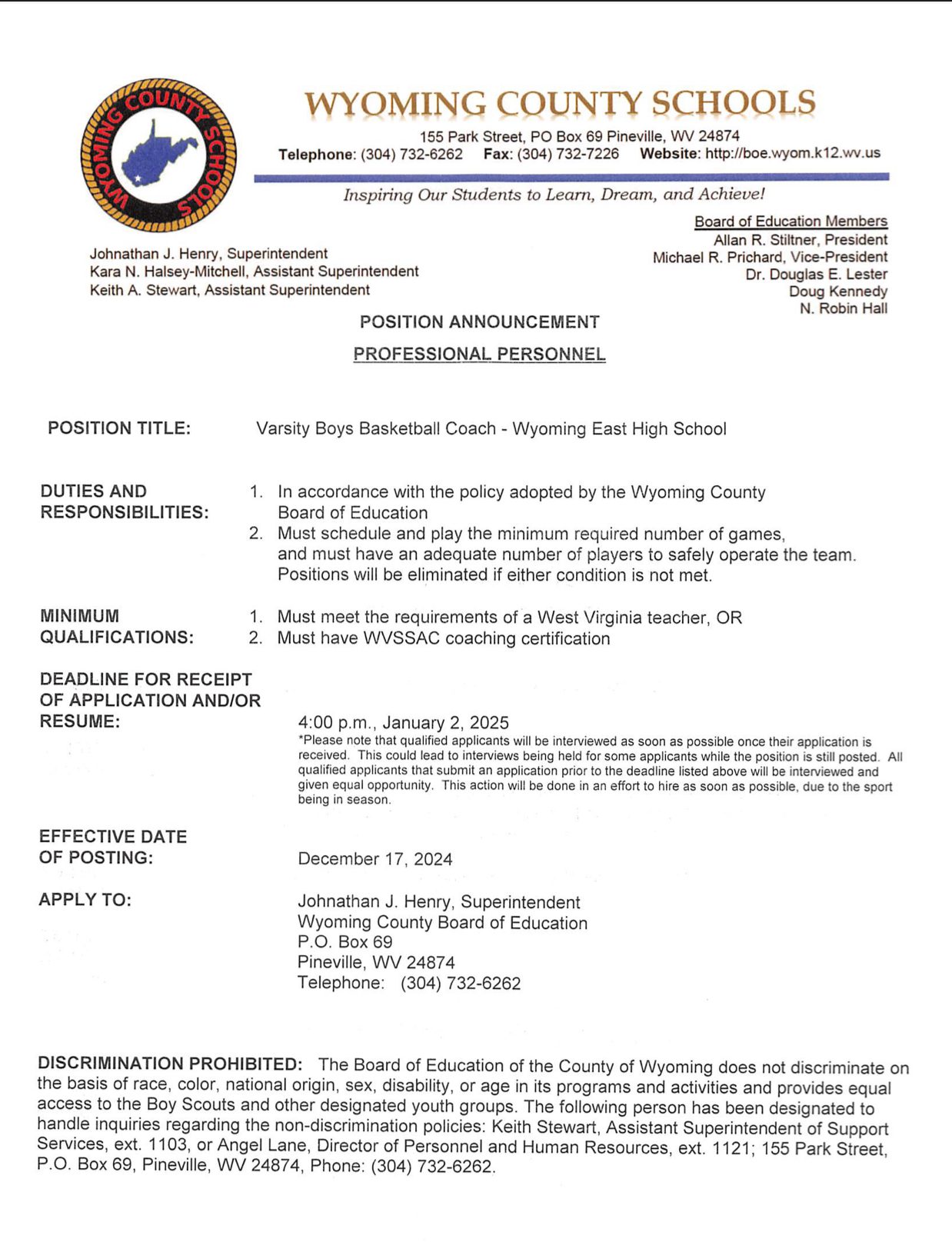 The job was posted on the Wyoming County Board of Education website effective Tuesday, Dec. 17.