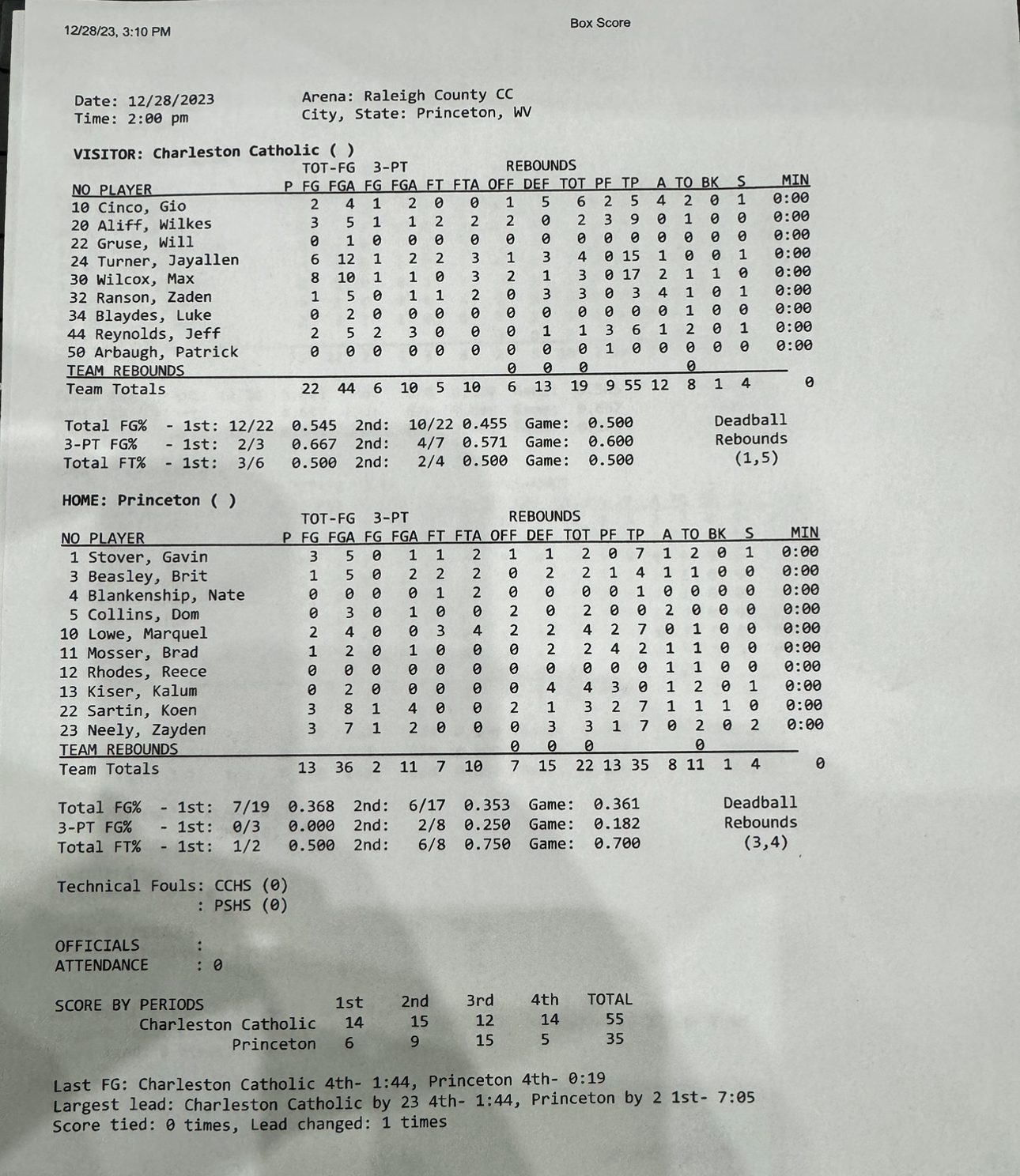 Max Wilcox led Catholic and all scorers with 17 points while Turner pitched in 15. Princeton had four different players score seven each in the loss.