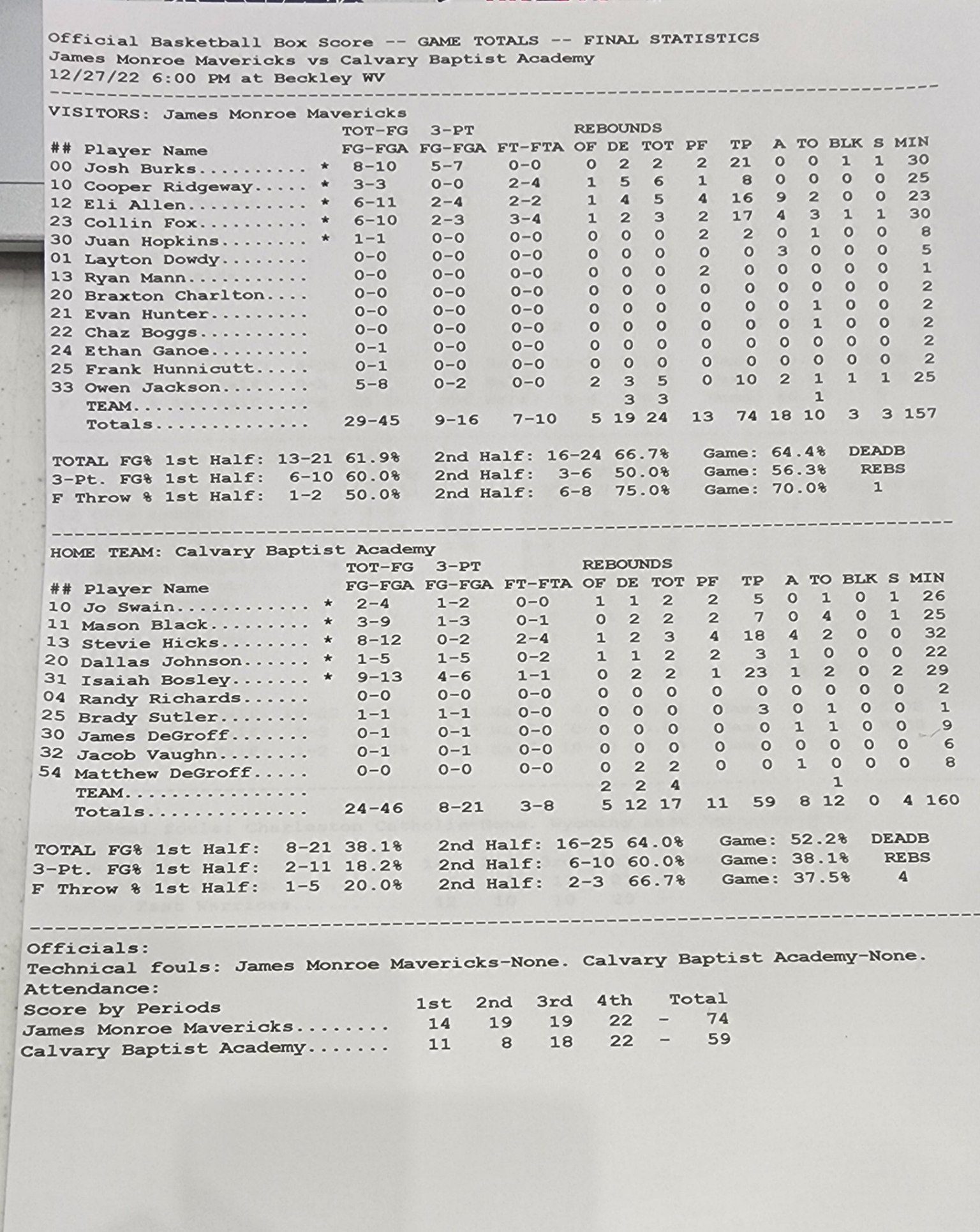 After falling behind early, James Monroe rallied to take a 14-11 lead after the first quarter. The lead went to 15 at the break despite Player of the Year candidate Eli Allen sitting most of the second quarter in foul trouble.