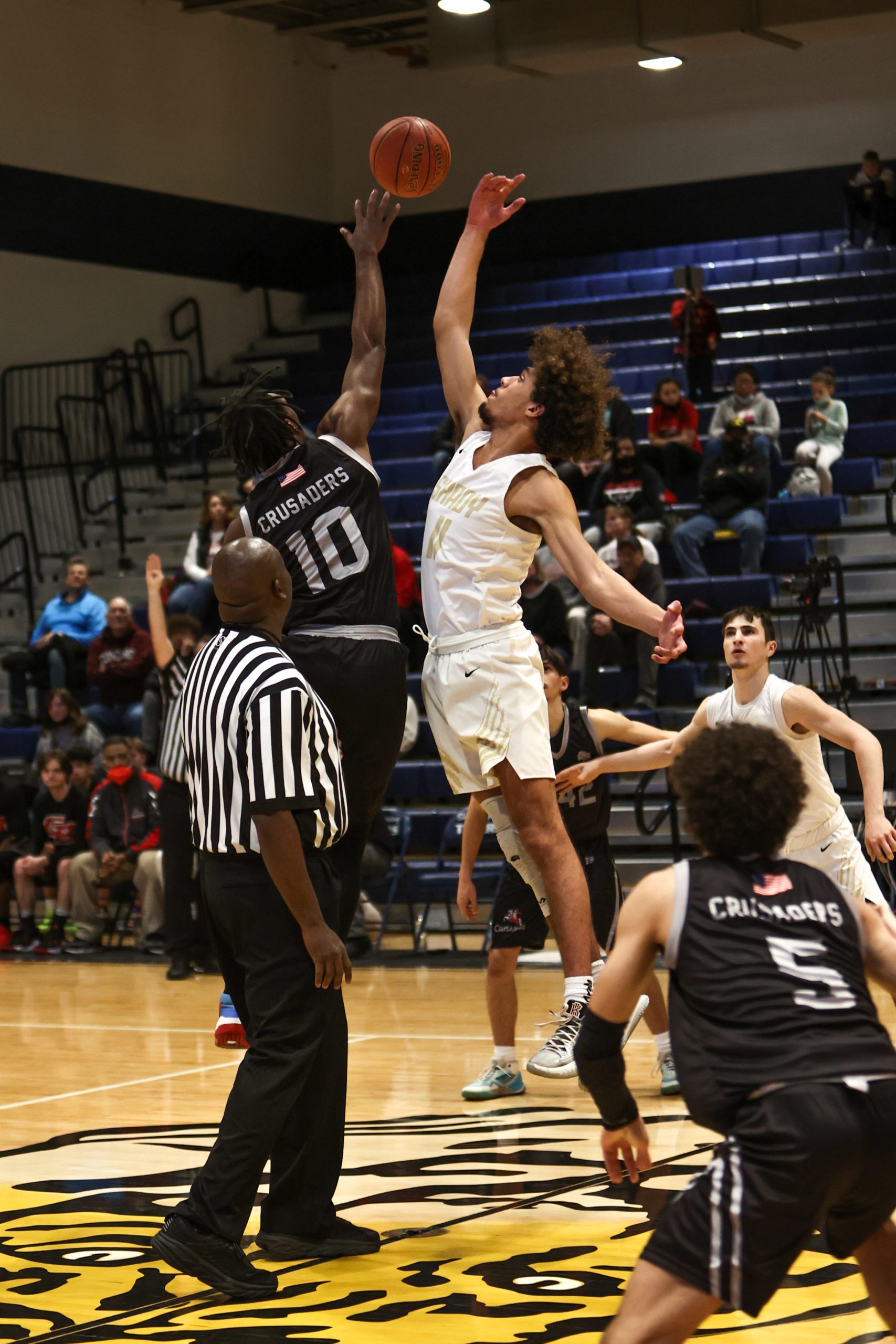 Leading the charge for the Tigers was all-state guard Braden Chapman, who’s struggled with his shot this season. Monday did little to change that with a 4 of 15 showing from the field, but he found a way to continuously bother the Crusaders, finishing with 15 points and 14 rebounds as well as six assists and five steals.