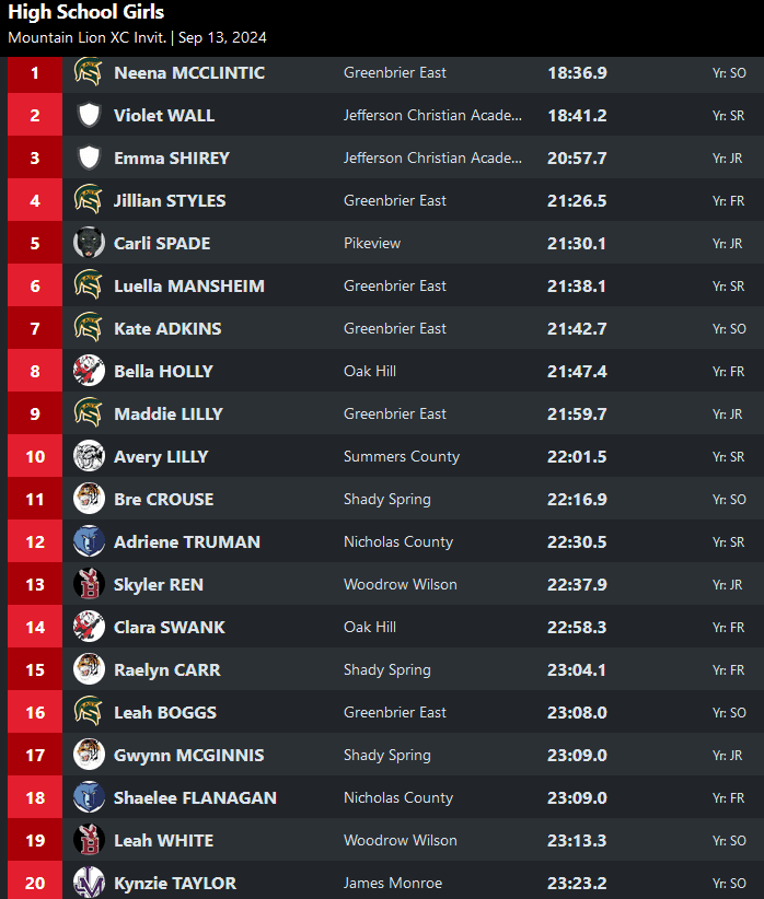 Summers County multi-sport standout Avery Lilly rounded out the top-10 with another strong race. Nicholas County state champion high jumper Adrienne Truman was 12th and teammate Shaelee Flanagan was 18th overall.