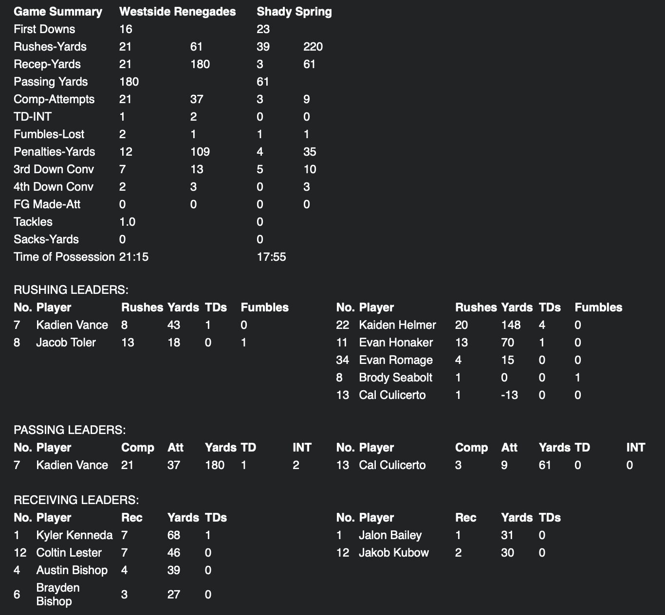 Westside, which struggled in its own right sustaining drives early, answered with a 12-play trek that resulted in a 5-yard touchdown run from Kadien Vance. The Tiger offense, aiming to get points before the half, stalled out at the Westside 34, giving the Renegades an opportunity to strike. And they did.