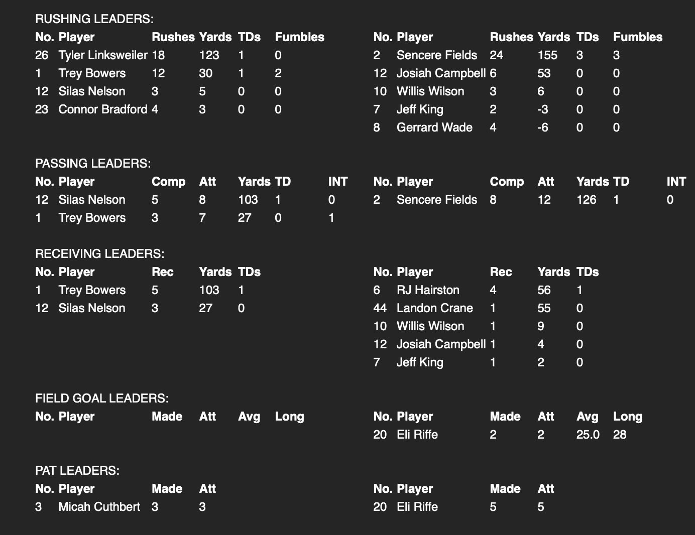 After forcing and recovering a Fields fumble at the 50 and tacking on 15 bonus yards after a Bluefield Ā personal foul penalty,Tyler Linkweiler opened and closed the Indy’s drive with a 35-yard touchdown scamper to make it a 26-21 game with 7:17 left in the third quarter.