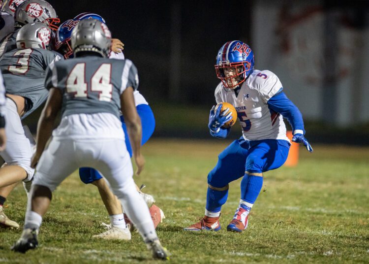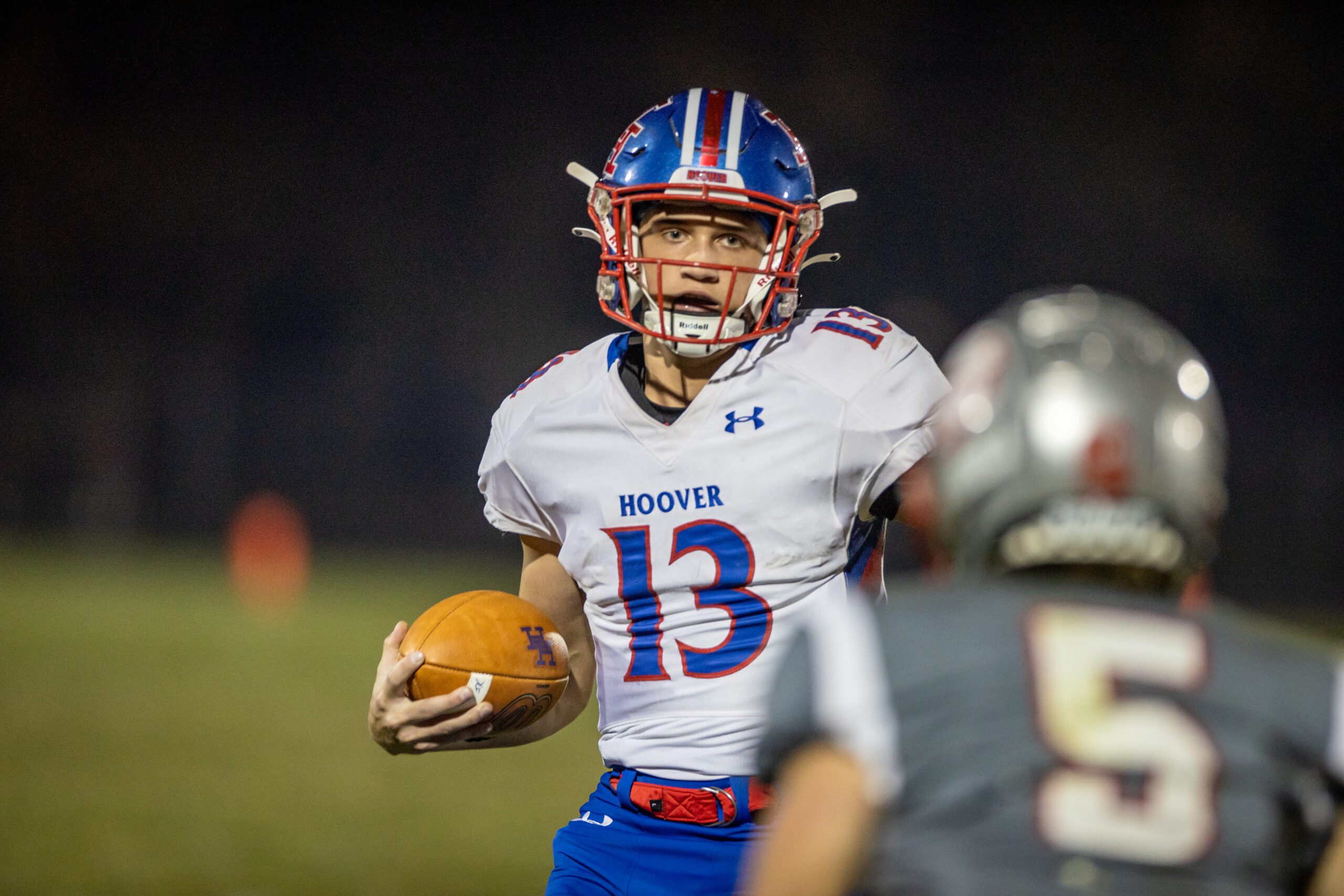 Huskies quarterback Dane Hatfield opened the scoring, scrambling 68 yards to go up 7-0. On the ensuing kickoff, Connor Brinckman caused a turnover and the Huskies recovered the fumble. The Hoover offense came back out and Rocco Frye scored the first of his four touchdowns on the evening on a 5-yard scamper to go up 14-0. In the second quarter, Rocco powered into the end zone on 13 and 14 yard carries, respectively, to go up 28-0.