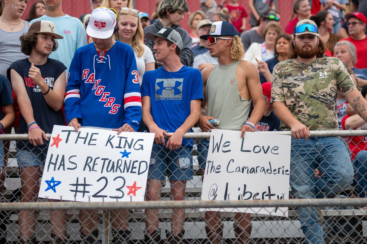 On the second drive for the defending champions, a holding penalty left them with a third-and-16 from the Liberty 46 yard line. Quarterback Trey Bowers dropped back and launched a dart down the sideline to sophomore Silas Nelson. Nelson gathered in the perfect strike from Bowers for a 13-0 lead.