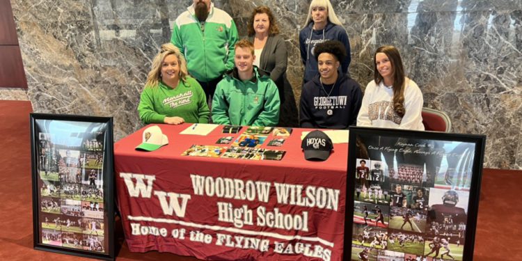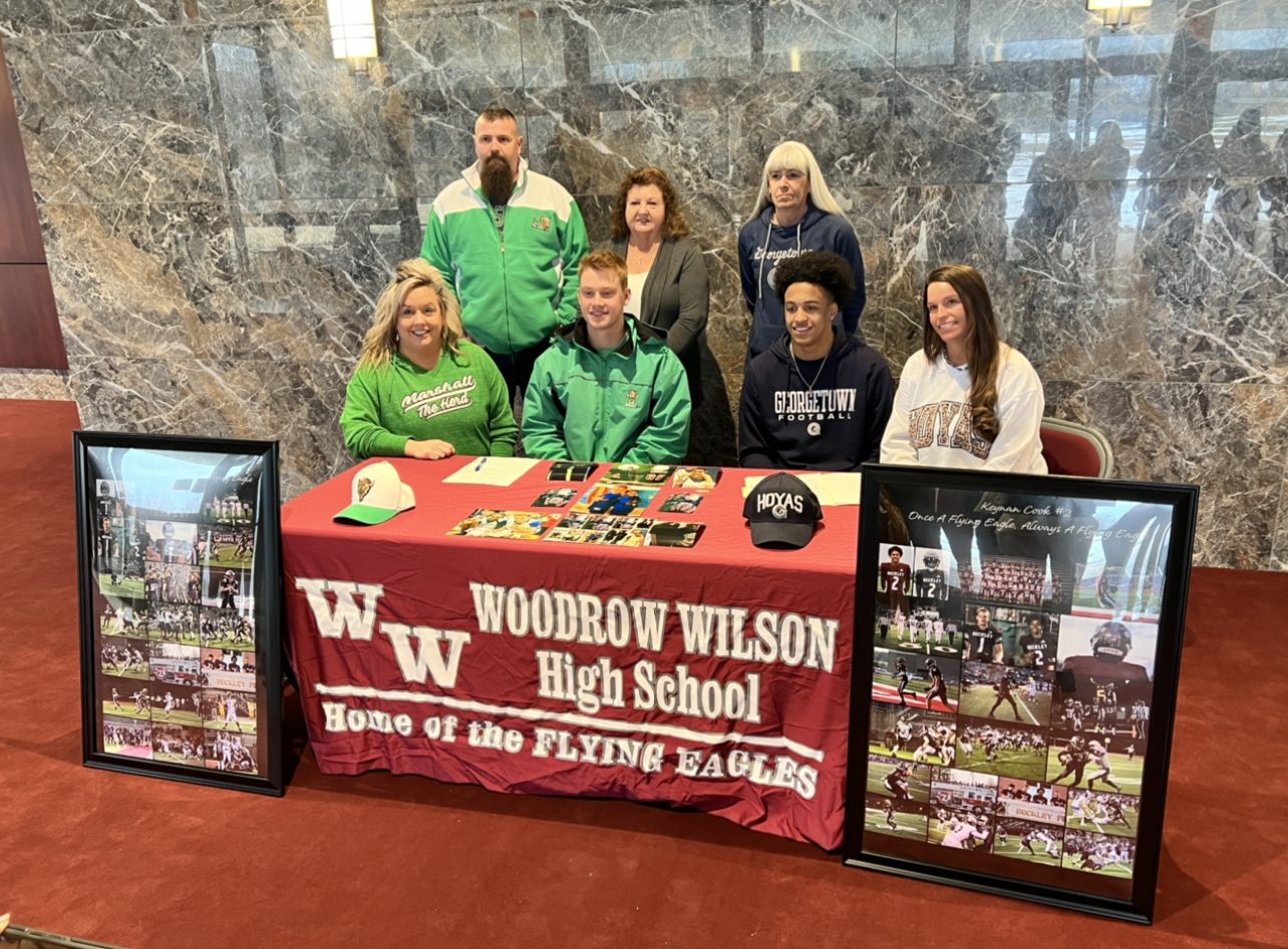Cook and McMillen, surrounded by friends, teammates and family, signed their National Letters of Intent Monday at Woodrow Wilson High School to play college football. McMillen, the Flying Eagles’ record setting QB will continue his career at Marshall while Cook, one of the most prolific receivers in program history, will take his talents to Georgetown.