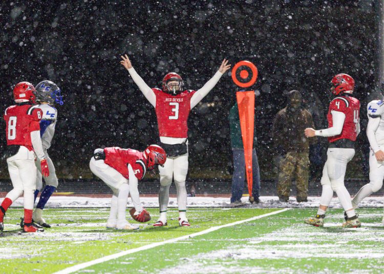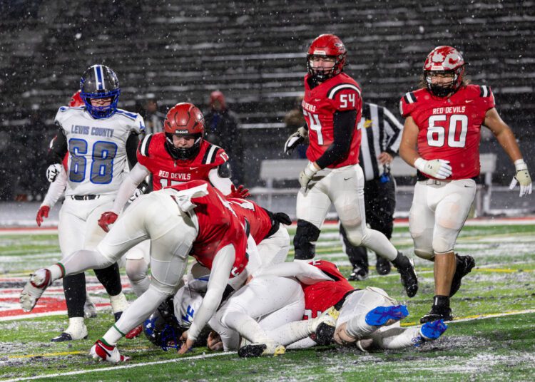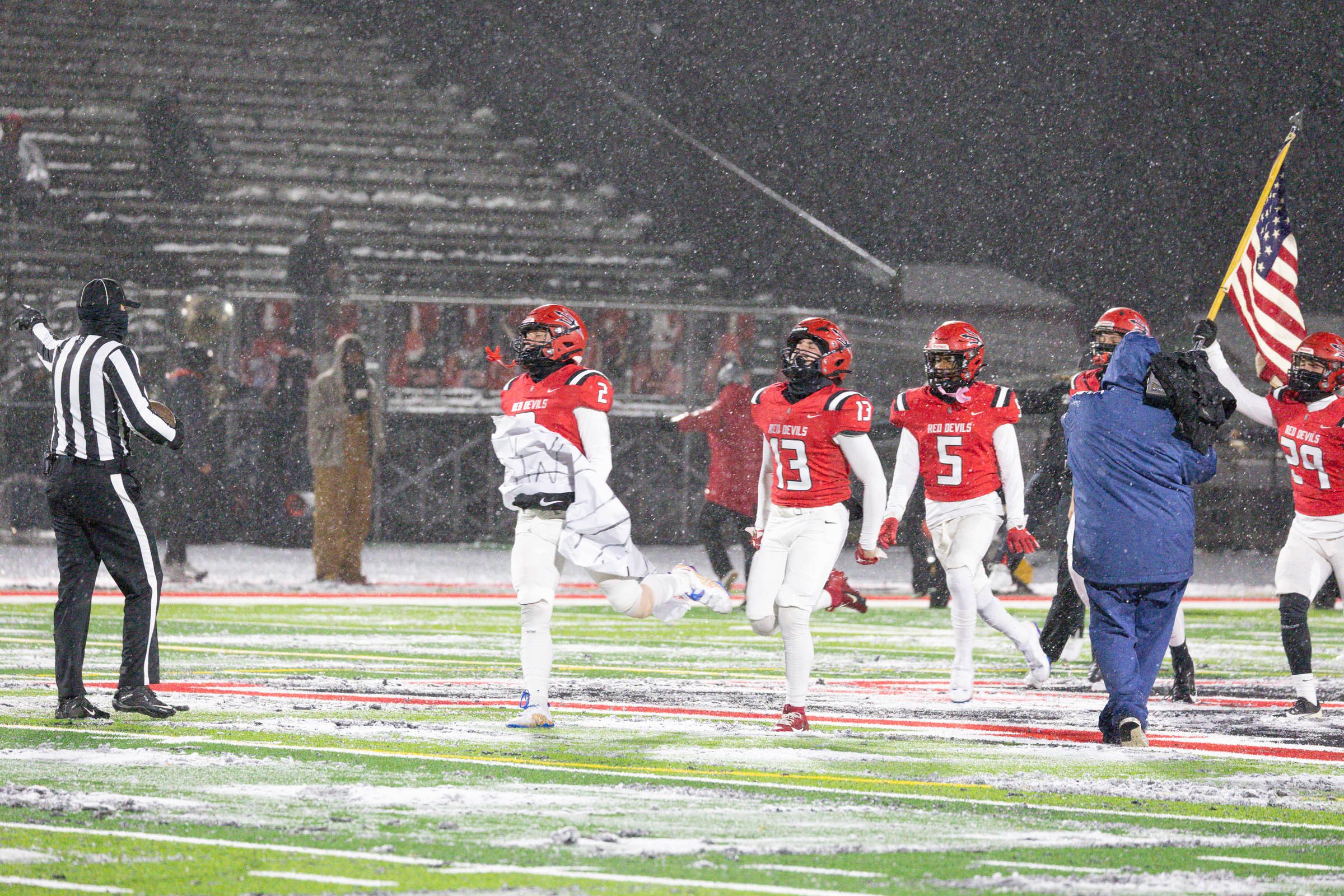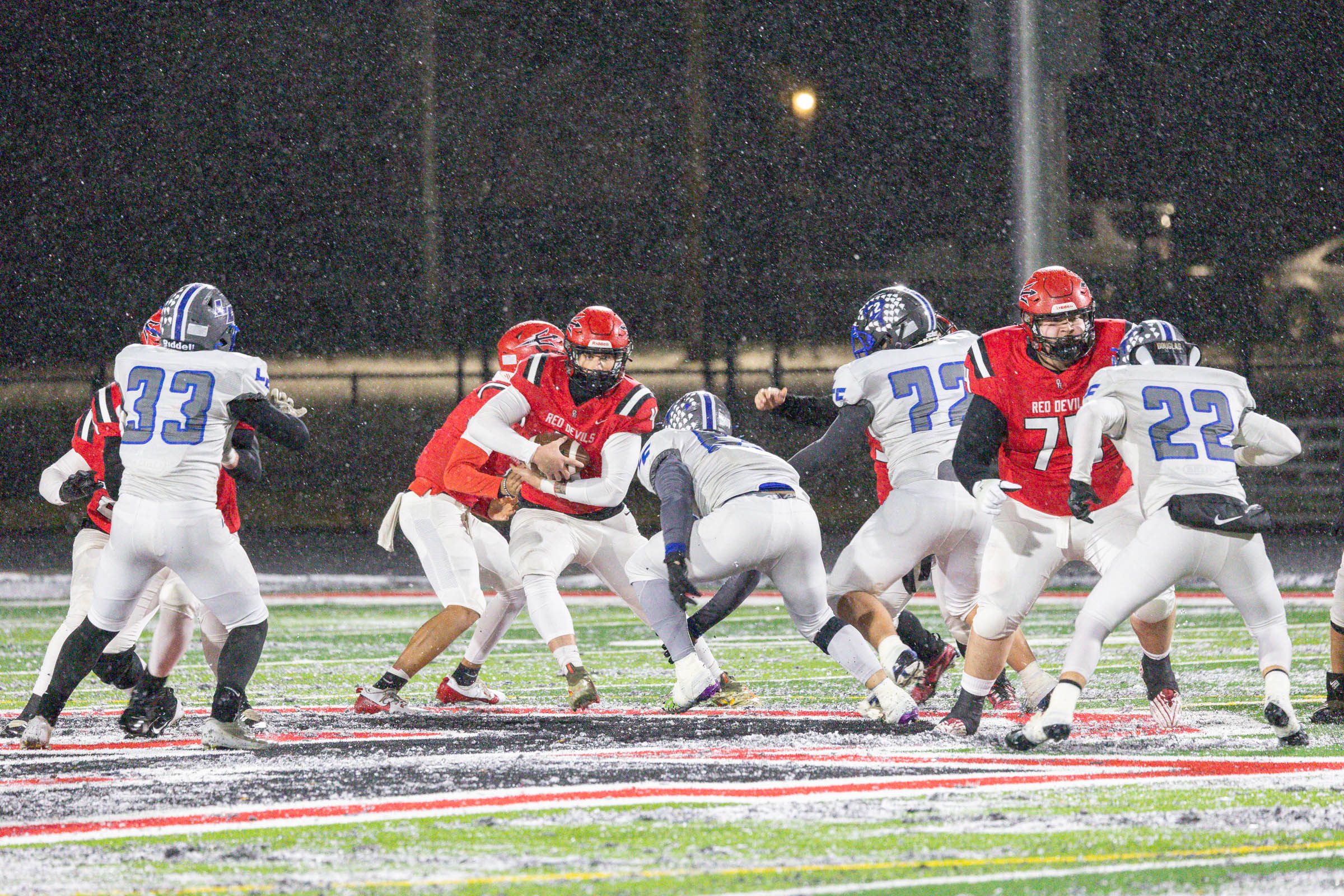 Scoring 20 straight points to break a scoreless halftime tie, the Red Devils cruised by Lewis County in the rain, sleet and snow at John P. Duda Stadium for a 27-6 win.