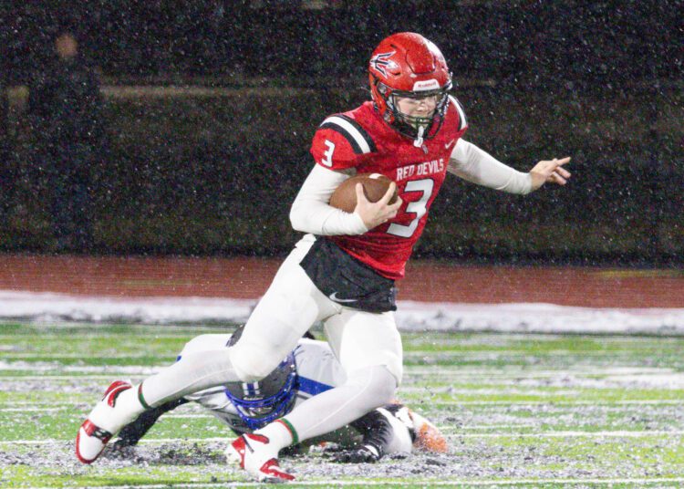 An interception by Luke Endicott after some heavy pressure from Green up the middle set the Red Devils up at midfield early in the fourth quarter. Ten plays later, J.D. Mauritz rolled in from one-yard out for a 20-0 lead.