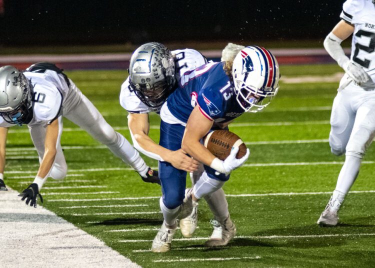 Facing a third-and-11 from their own 40 on their opening drive, the Patriots converted on a 13-yard pass from Trey Bowers to Colten Caron and never looked back. Five plays and 47 yards later Price plunged into the end zone and converted on the two-point attempt to give the hosts a lead they never relinquished.