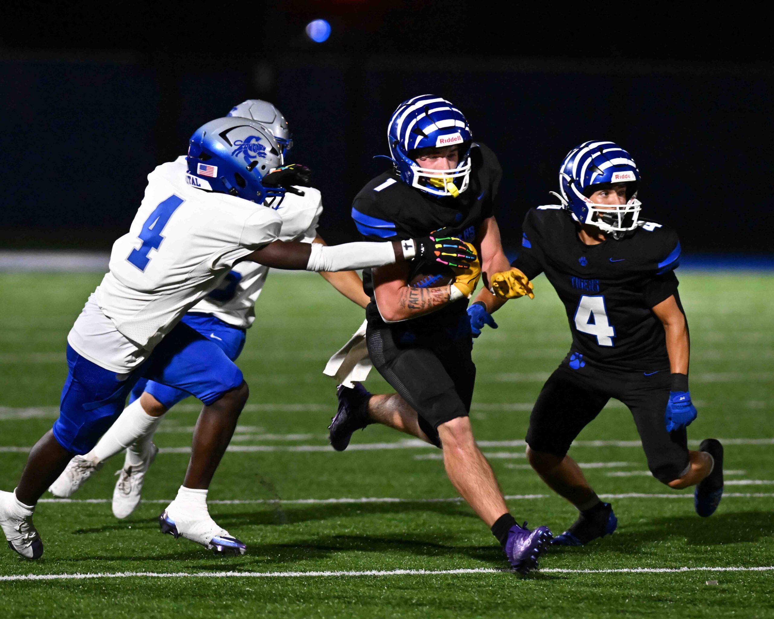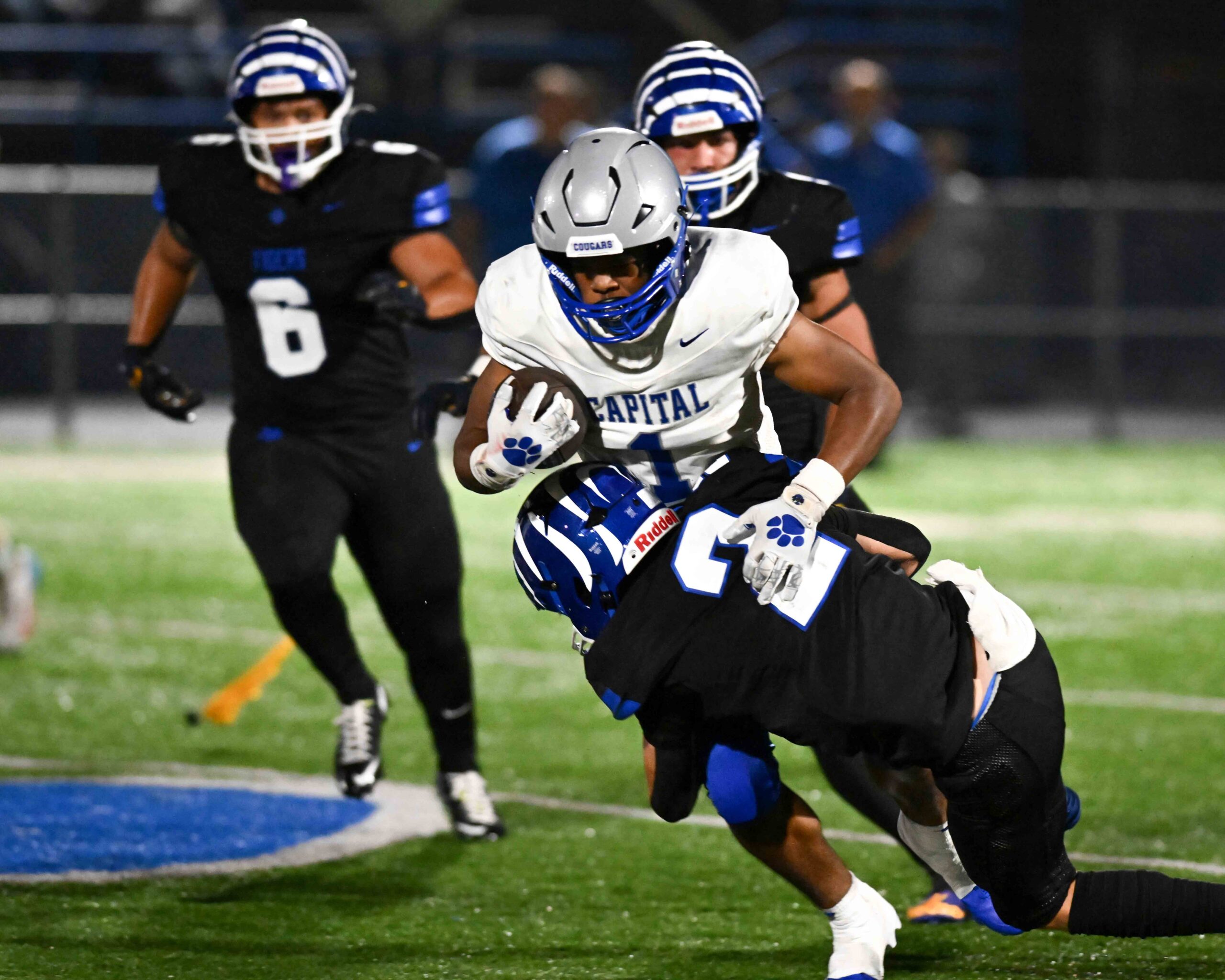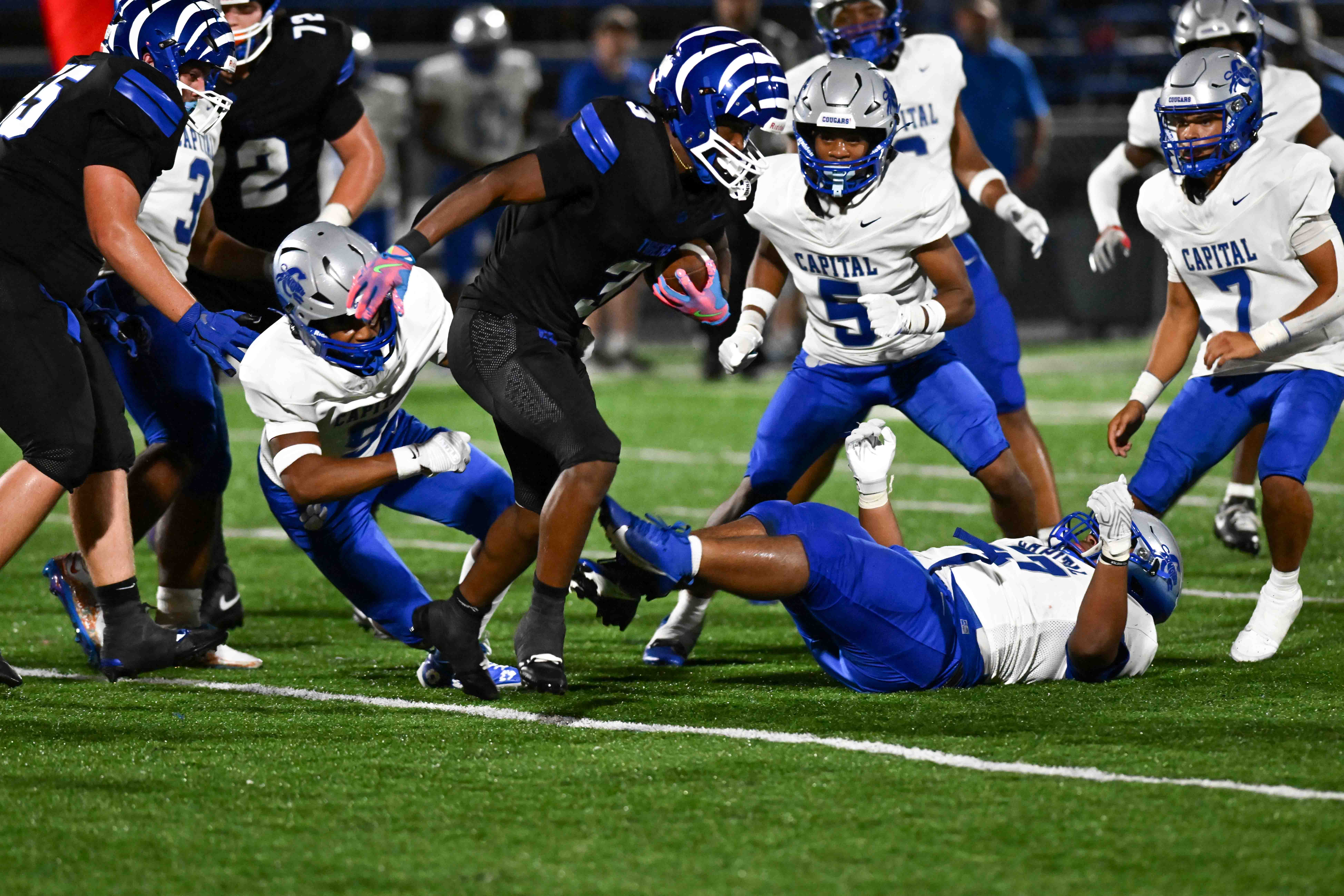 On the first play from scrimmage out of the break Capital running back David Robinson fumbled the ball, leading to Lowe’s third rushing touchdown of the game, a seven-yard jaunt two plays later. The wheels fell off on the following drive when a second-and-9 snap went over the head of Capital’s Fernando Valdivia before it was secured by Penn State commit Daniel Jennings at the Capital 19. The junior edge rusher took the scoring honors two plays later, rumbling in from 12 yards out for the Tigers’ final points of the game.