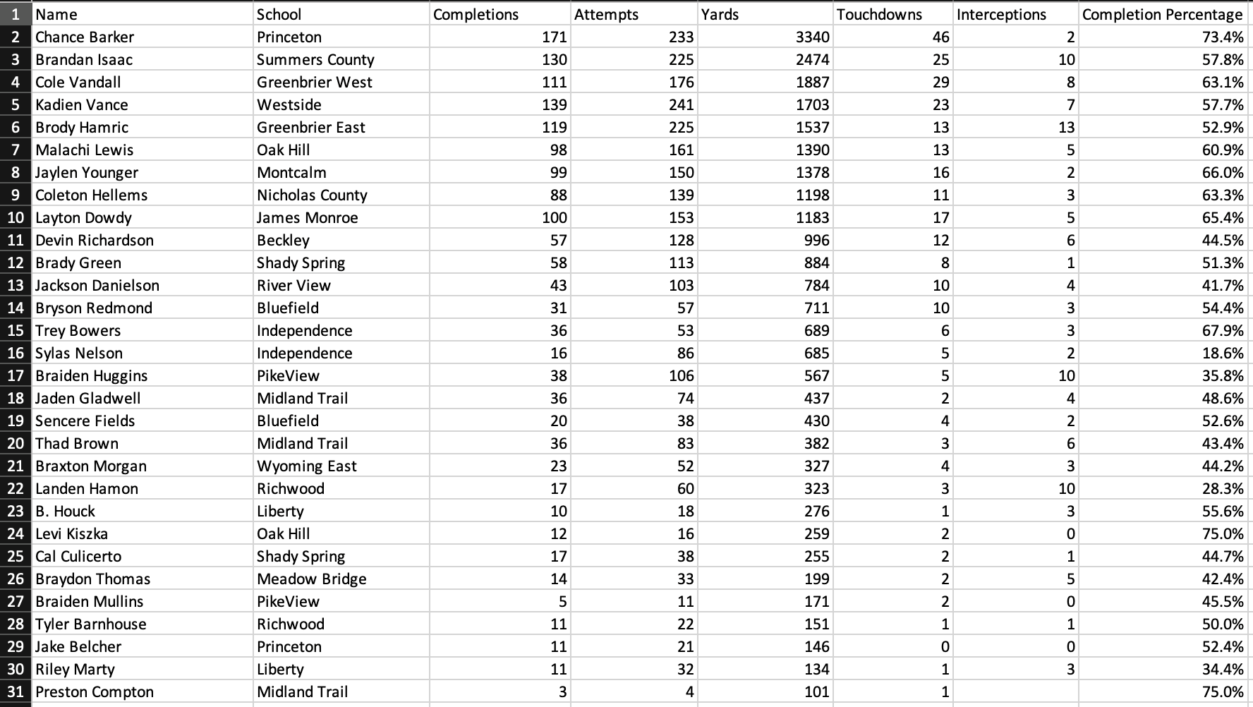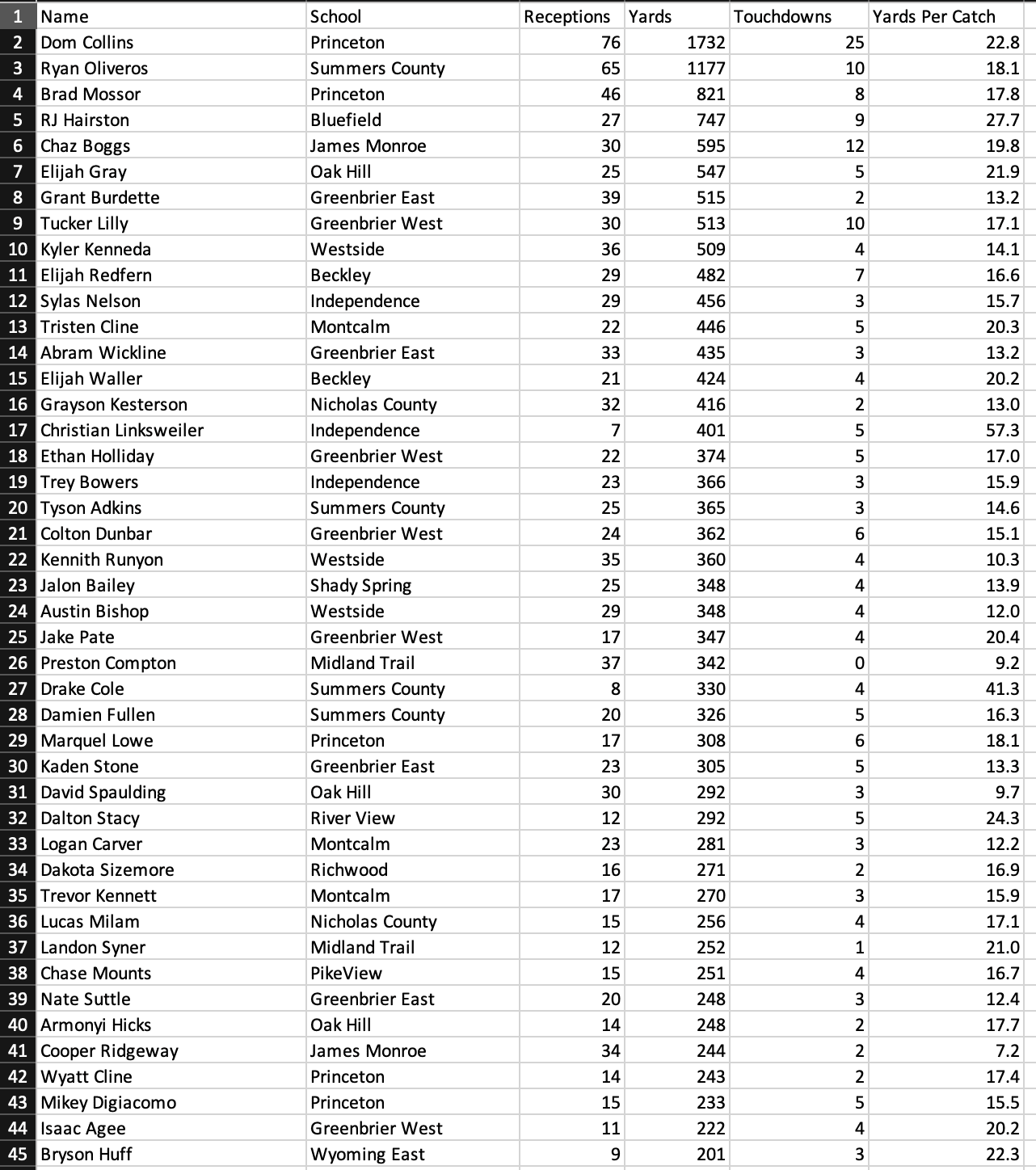Princeton’s Chance Barker leads the area in every passing metric amongst qualified players (minimum 50 attempts). Dominick Collins leads the area  in receiving yards, catches and touchdowns while running back Marquel Lowe leads the area in rushing yards and yards from scrimmage with 1,991.
