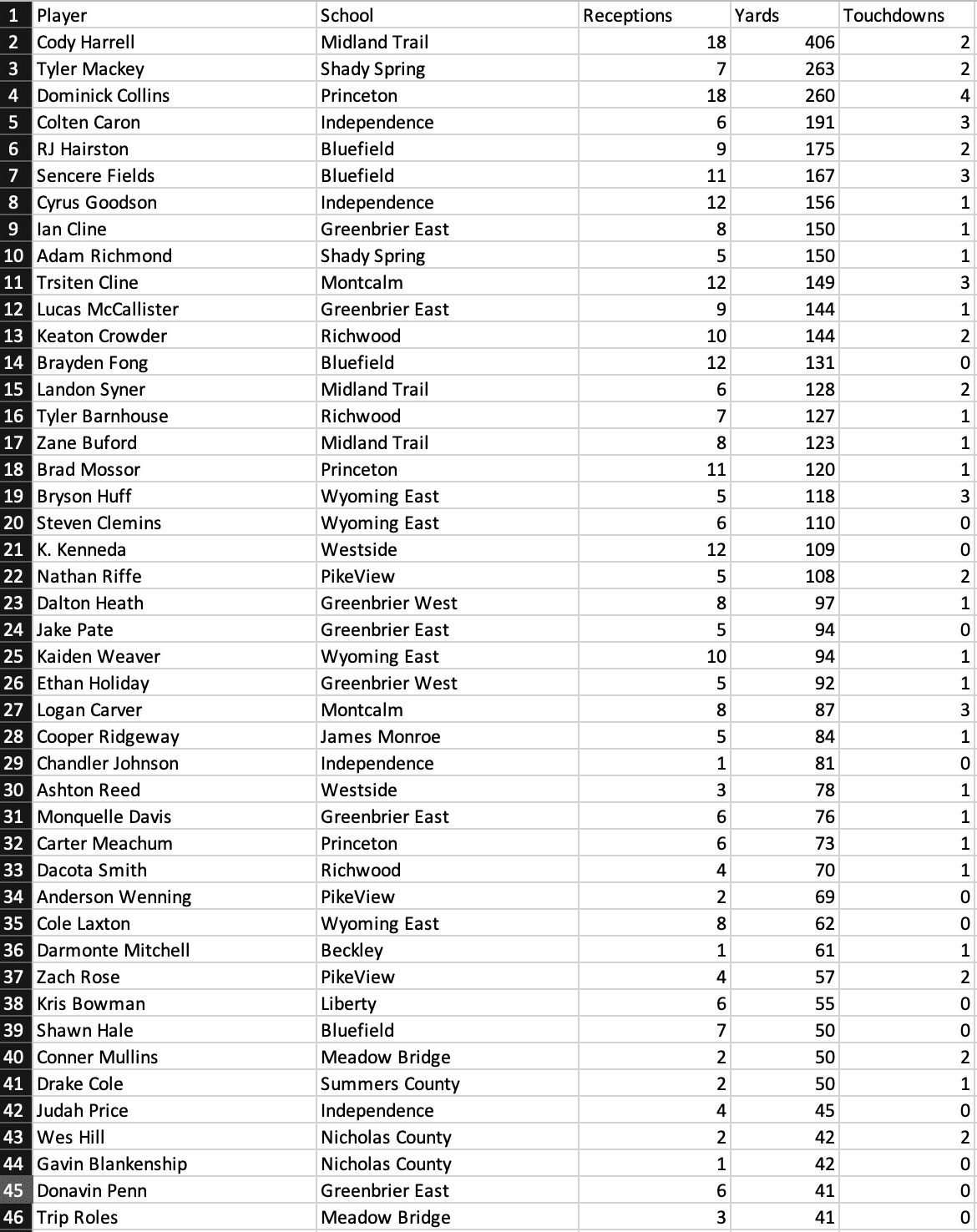 Attached is a list of the area statistical leaders through Week 3 of the prep football season. In order to be on the list, coaches must submit their players’ individual stats to tylerjackson@lootpress.com by Monday afternoon. Stats for Bluefield were compiled using our box scores as official stats have not been made available. For stats not made available by a team’s coach, we used the stats submitted by the opposing team.