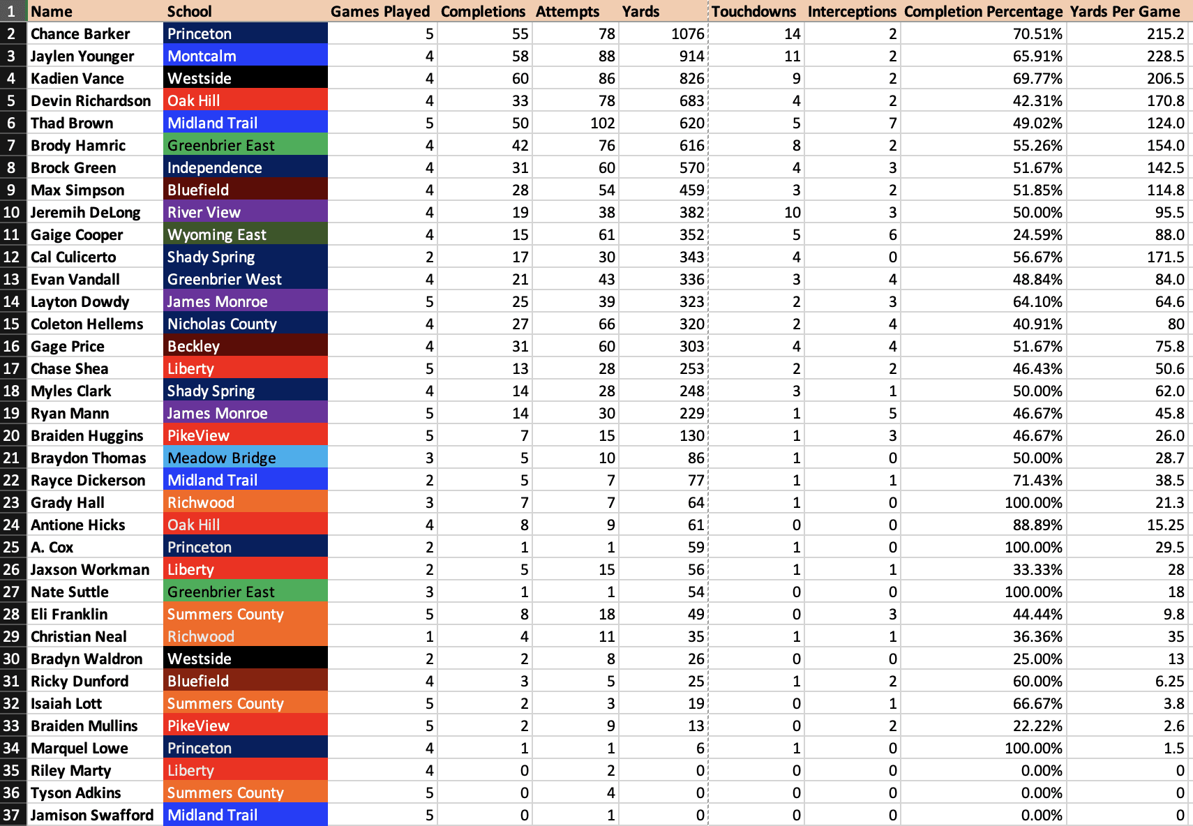 Attached are the area statistical leaders through Week 5 of the prep football season.