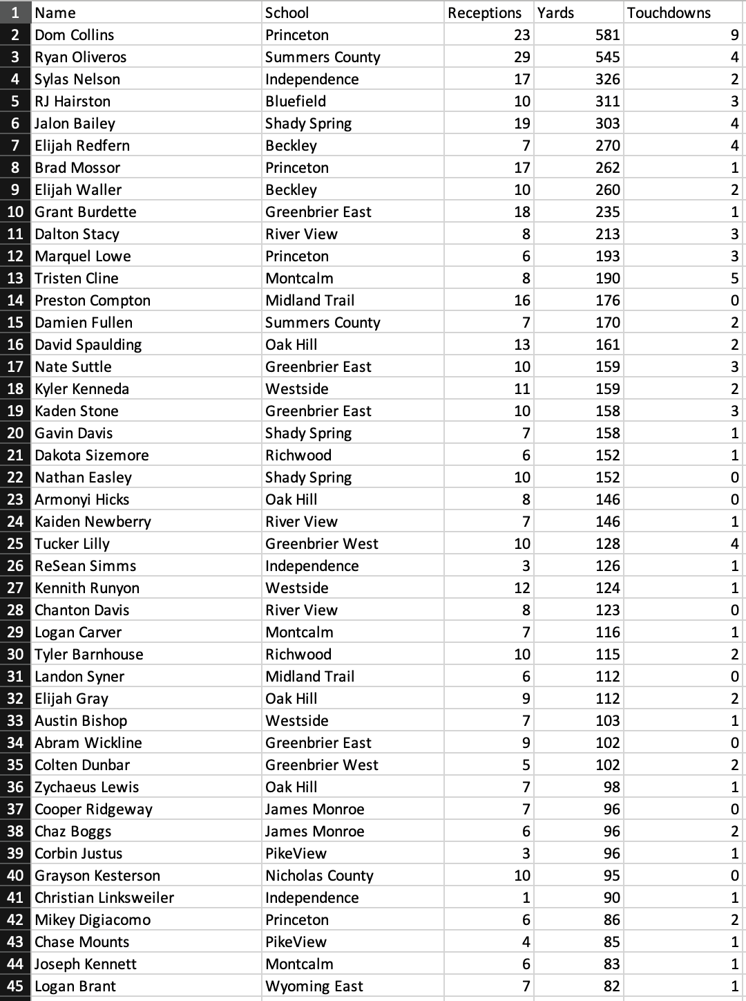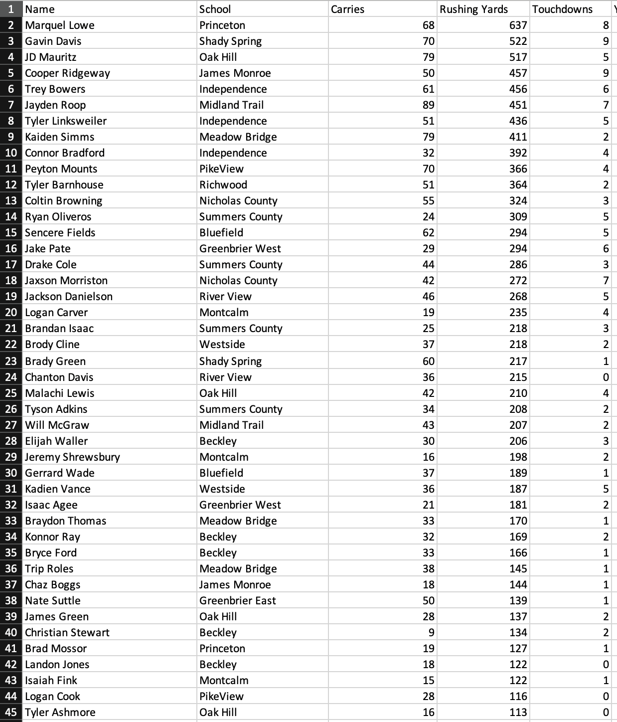 Attached is a list of the area statistical leaders through Week 6 of the prep football season (Nicholas, Fayette, Raleigh, Wyoming, Mercer, Summers and Monroe counties). In order to be on the list, coaches must submit their players’ individual stats to tylerjackson@lootpress.com by Monday afternoon. For stats not made available by a team’s coach, we used the stats submitted by the opposing team.