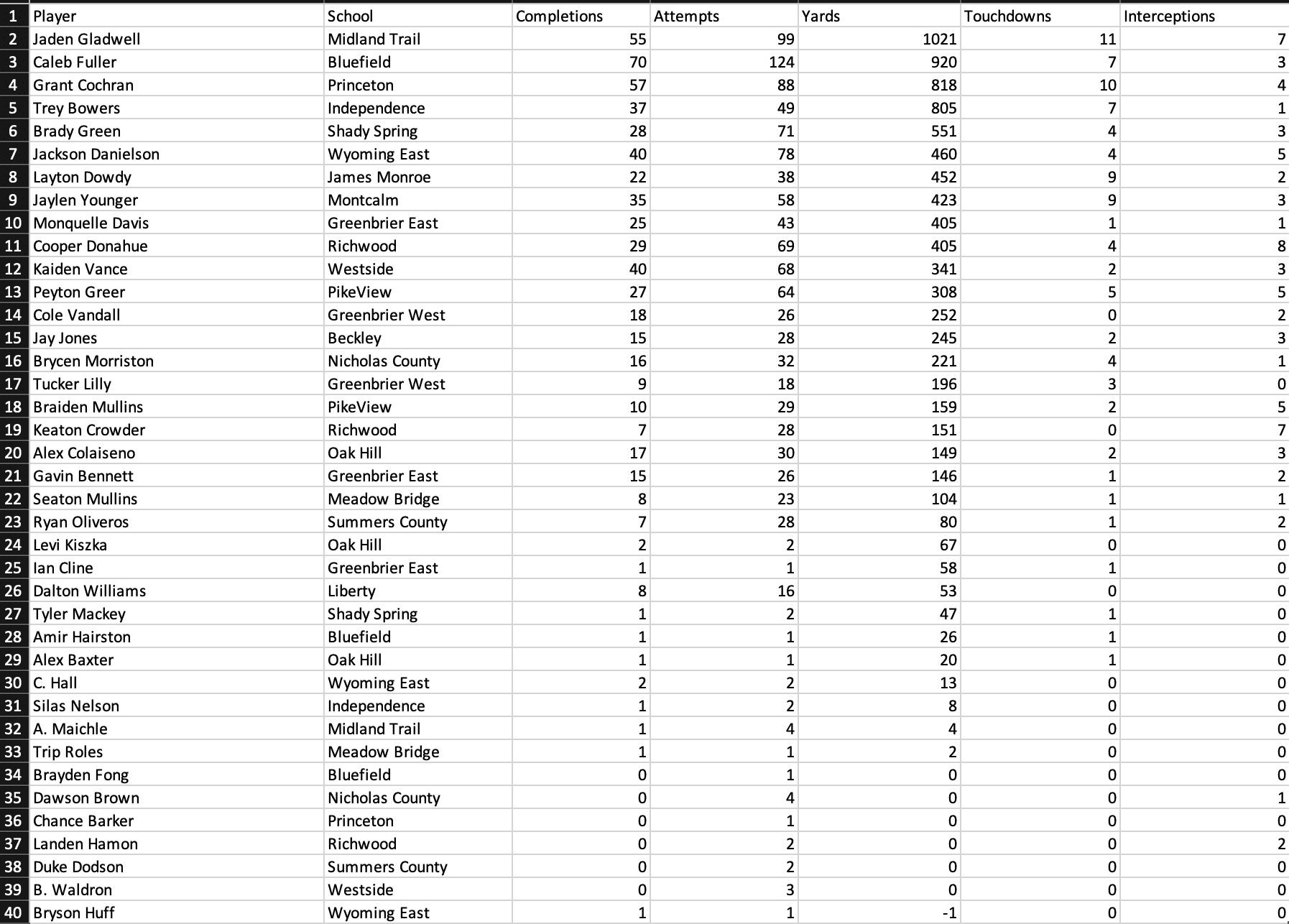 Midland Trail’s Jaden Gladwell remains atop the passing yardage and touchdown leaderboard, becoming the first area QB to throw for 1,000 yards. Princeton QB Grant Cochran sits behind him with 10 touchdown passes.