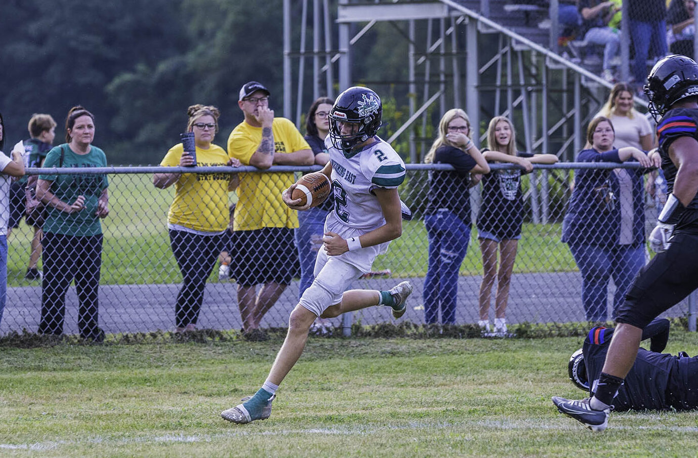 East QB Jackson Danielson led the charge, rushing 21 times for 214 yards and five touchdowns while completing seven passes for 71 yards.