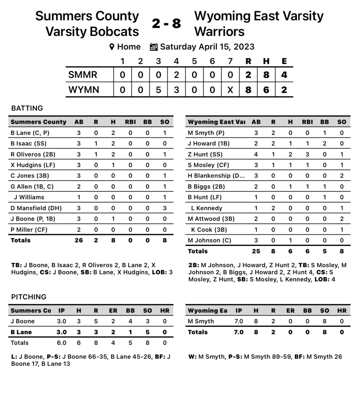 New Richmond – Miken Smyth allows just two runs, both unearned, Saturday as Wyoming East picked up an 8-2 win over Summers County.