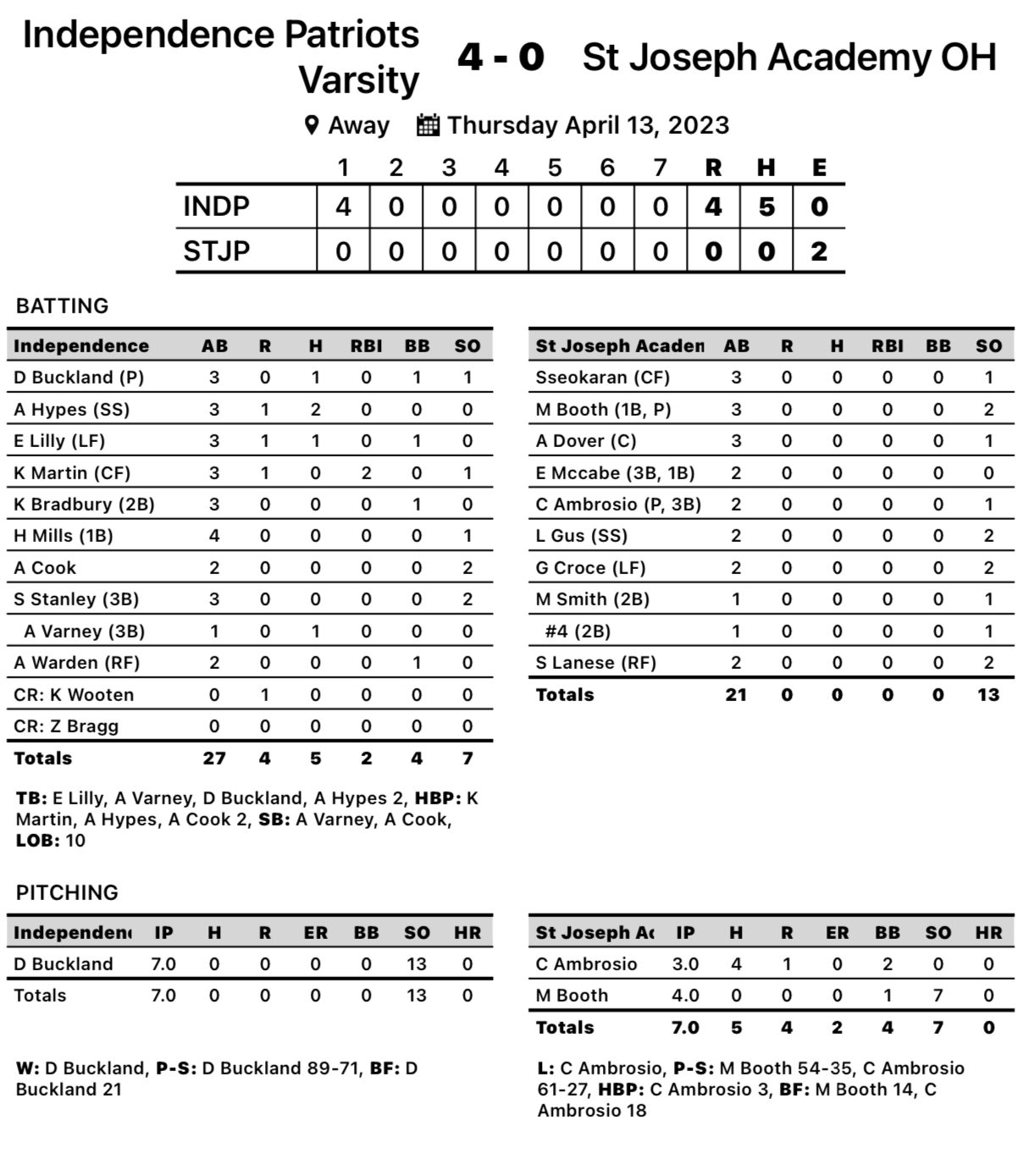 Delaney Buckland tossed a complete-game shutout in the opener, a 4-0 Indy win against St. Jospeh Academy out of Ohio. Buckland fanned 13 in the win while Kendal Martin drove in a pair of runs.