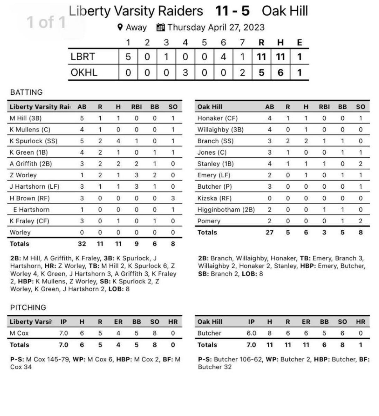Oak Hill – Liberty jumped out to a 5-0 lead and never looked back, earning an 11-5 win over Oak Hill Thursday in Oak Hill.