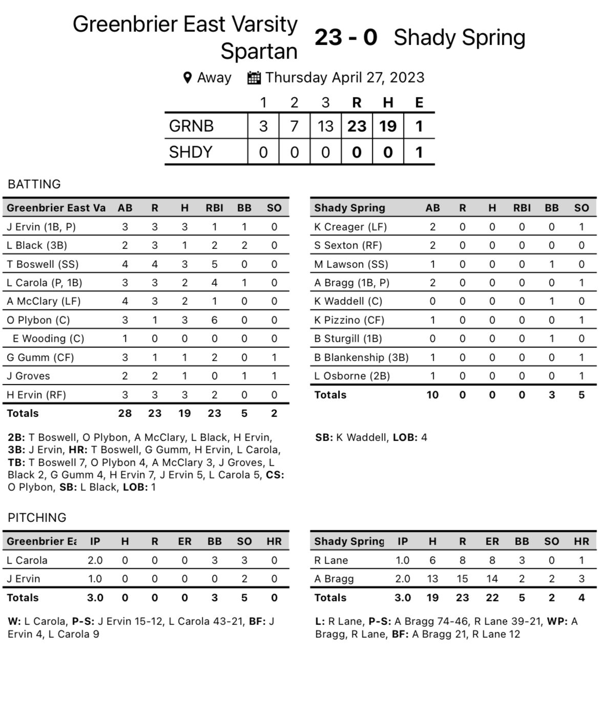 Greenbrier East 23, Shady Spring 0