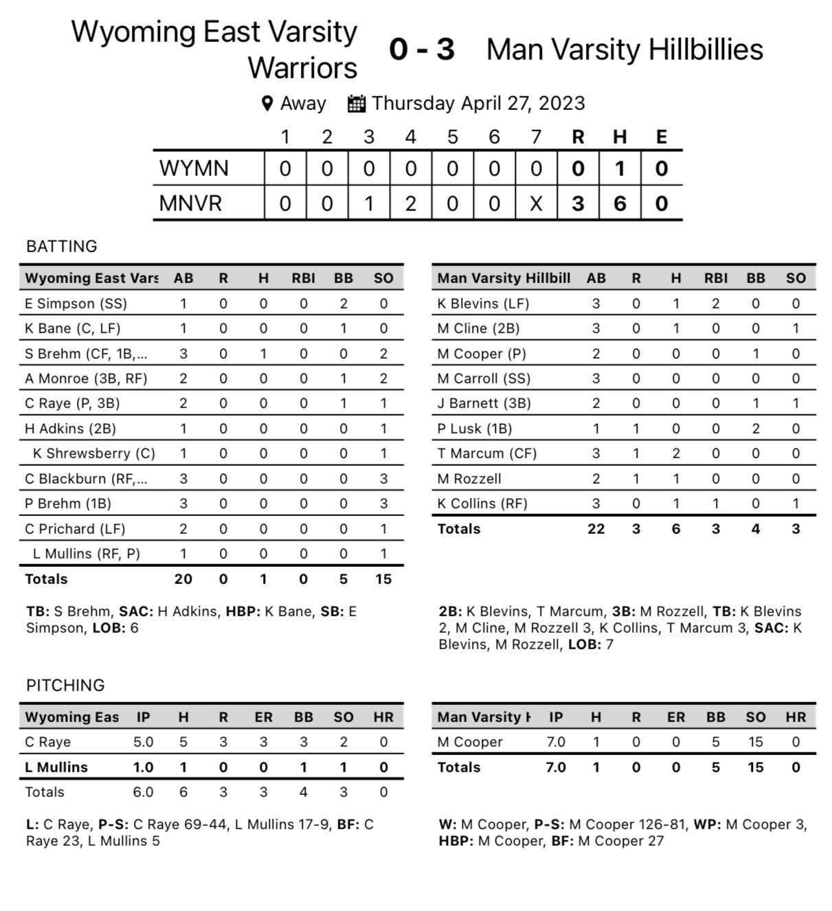 Man – Morgan Cooper held Wyoming East to one hit for the second time in three days, leading Man to a 3-0 win over the Lady Warriors in Man.