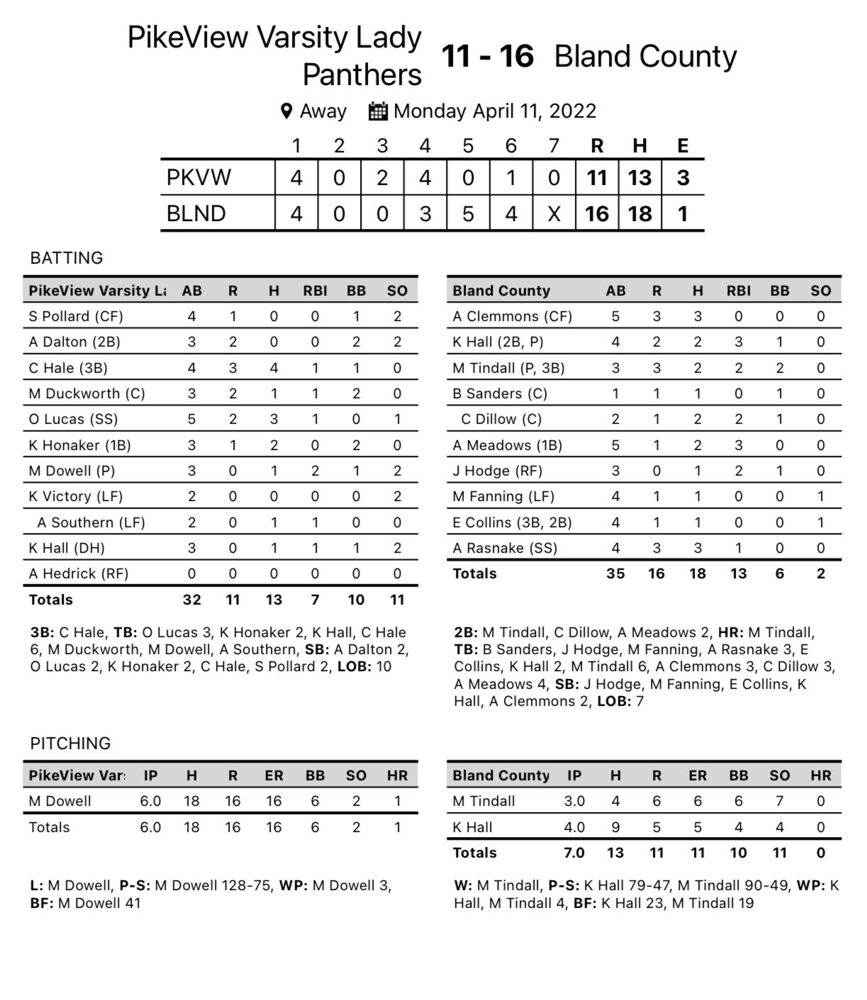 Bland Va. – PikeView yielded 18 hits Monday, dropping a 16-11 decision on the road to Bland County.