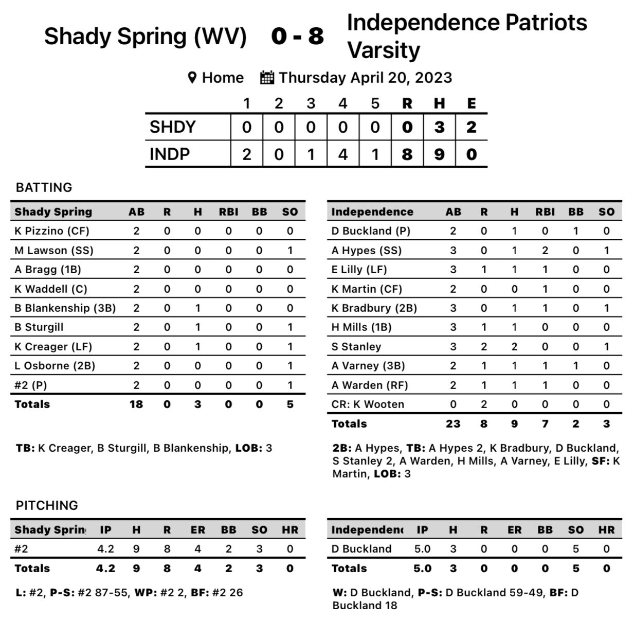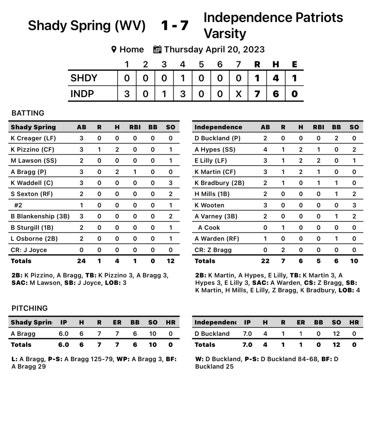 Independence promptly squashed the rally attempt in the bottom half of the frame, scoring three runs on RBI hits by Alli Hypes and Emma Lilly. Shady collected a pair of hits over the final three innings but they never materialized into runs.