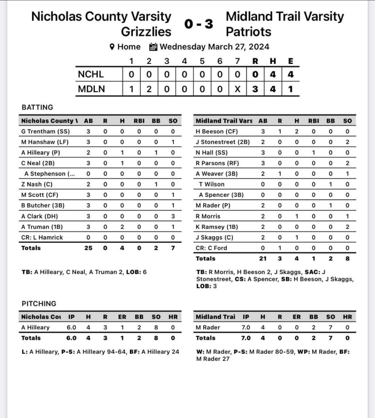 Midland Trail 3, Nicholas County 0