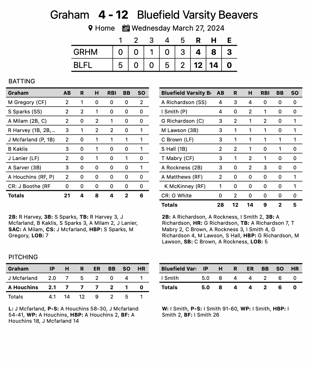 Bluefield – Bluefield jumped out to a 5-0 lead, run-ruling rival Graham, Va. 12-4 in five innings.