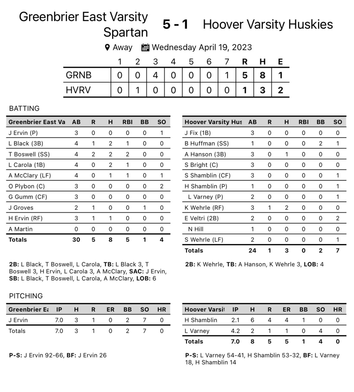 Falling Rock – Greenbrier East pounded eight hits, erupting for four runs in the third inning of a 5-1 win over Class AA Herbert Hoover Wednesday in Falling Rock.