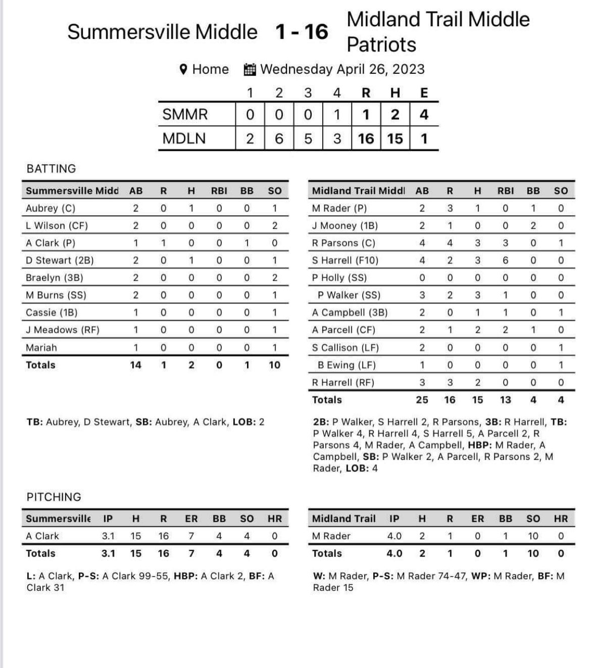 Hico – Midland Trail Middle rolled to another win Wednesday, beating Summersville Middle 16-1 in Hico.
