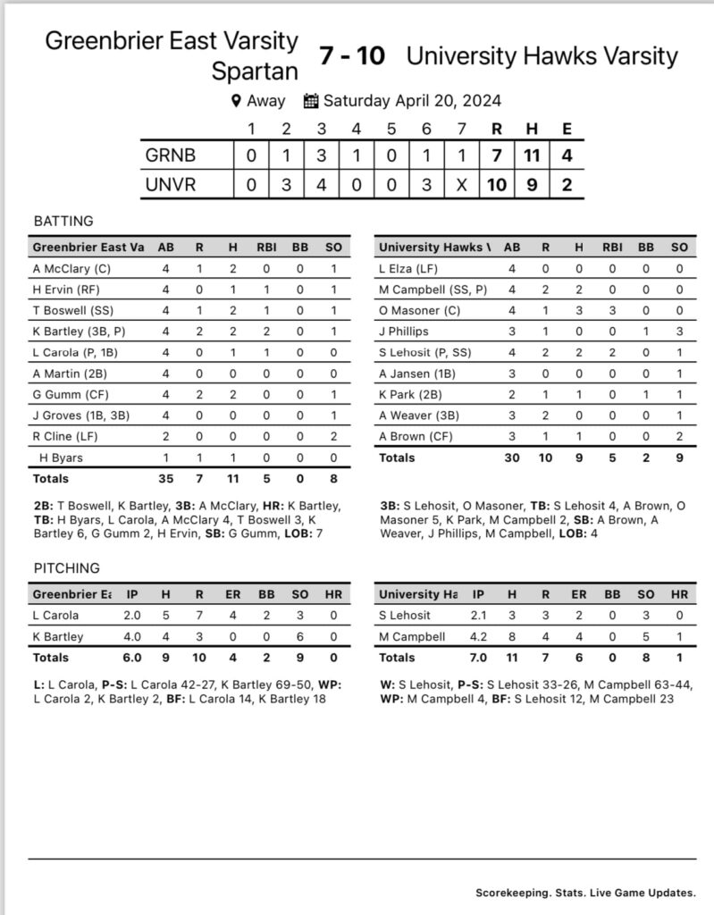 Morgantown – Greenbrier East dropped both games of a doubleheader Saturday, 5-4 to Morgantown and 10-7 to University.