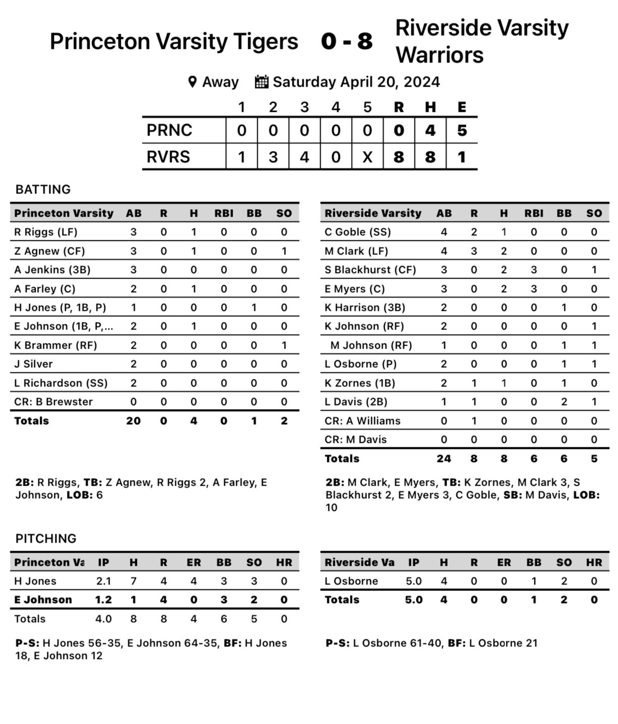 Riverside 8, Princeton 0