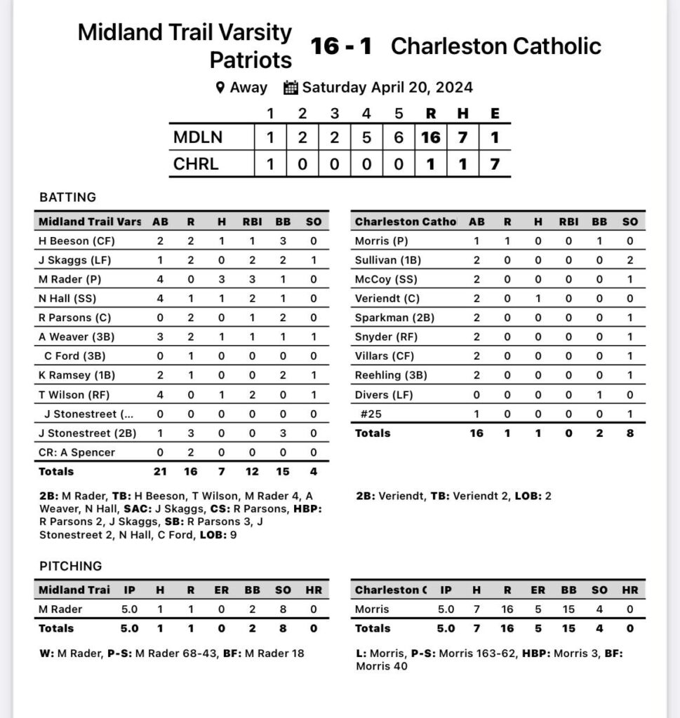 Midland Trail 16, Charleston Catholic 1 (5 innings)